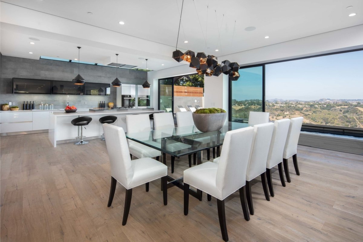 Adorning the dining room at 2484 Roscomare Rd, the Ekiya Chandelier becomes a statement of refined elegance, casting a warm, inviting glow across the space where moments of togetherness unfold. Its sophisticated design, embodying both modernity and timeless charm, enhances the room’s ambiance, providing a focal point that draws both eyes and conversation upward. Simultaneously, in the kitchen, a series of meticulously chosen pendant lights suspend gracefully above, offering precise illumination that accentuates the sleek, functional surfaces below.