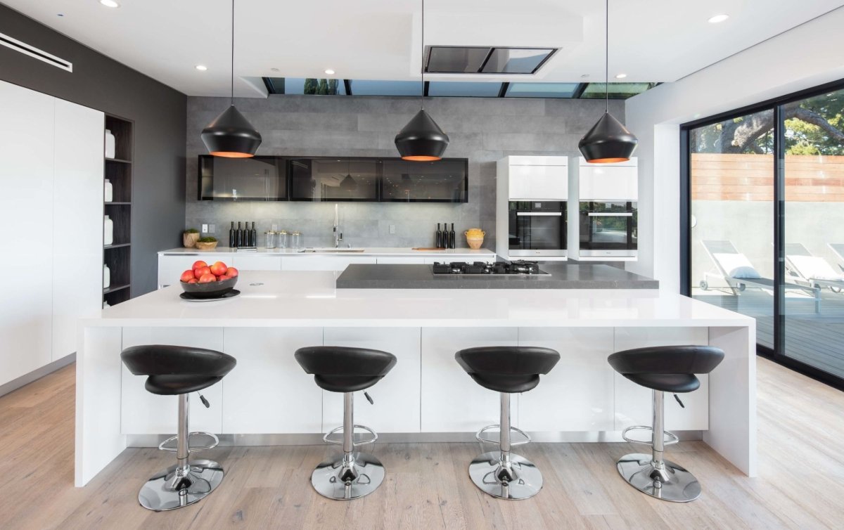 Adorning the dining room at Roscomare, the Ekiya Chandelier becomes a statement of refined elegance, casting a warm, inviting glow across the space where moments of togetherness unfold. Its sophisticated design, embodying both modernity and timeless charm, enhances the room’s ambiance, providing a focal point that draws both eyes and conversation upward. Simultaneously, in the kitchen, a series of meticulously chosen pendant lights suspend gracefully above, offering precise illumination that accentuates the sleek, functional surfaces below. These lighting choices, while aesthetically modern, serve dual purposes: to illuminate the practicalities of culinary creation and dining while also elevating the inherent architectural beauty of each space, seamlessly aligning with the client's vision of a home where every detail melds functionality with understated, elegant design.