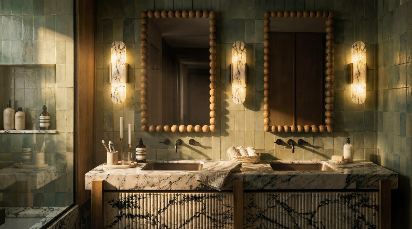 • Bathroom Sconces: Mount wall sconces at eye level, 28 to 36 inches apart, to ensure shadow-free grooming.