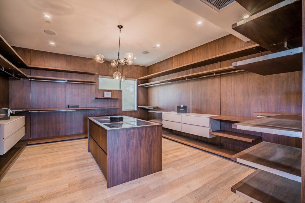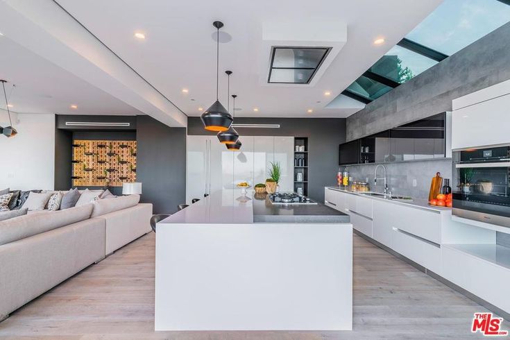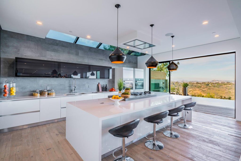 Adorning the dining room at 2484 Roscomare Rd, the Ekiya Chandelier becomes a statement of refined elegance, casting a warm, inviting glow across the space where moments of togetherness unfold. Its sophisticated design, embodying both modernity and timeless charm, enhances the room’s ambiance, providing a focal point that draws both eyes and conversation upward. Simultaneously, in the kitchen, a series of meticulously chosen pendant lights suspend gracefully above, offering precise illumination that accentuates the sleek, functional surfaces below.