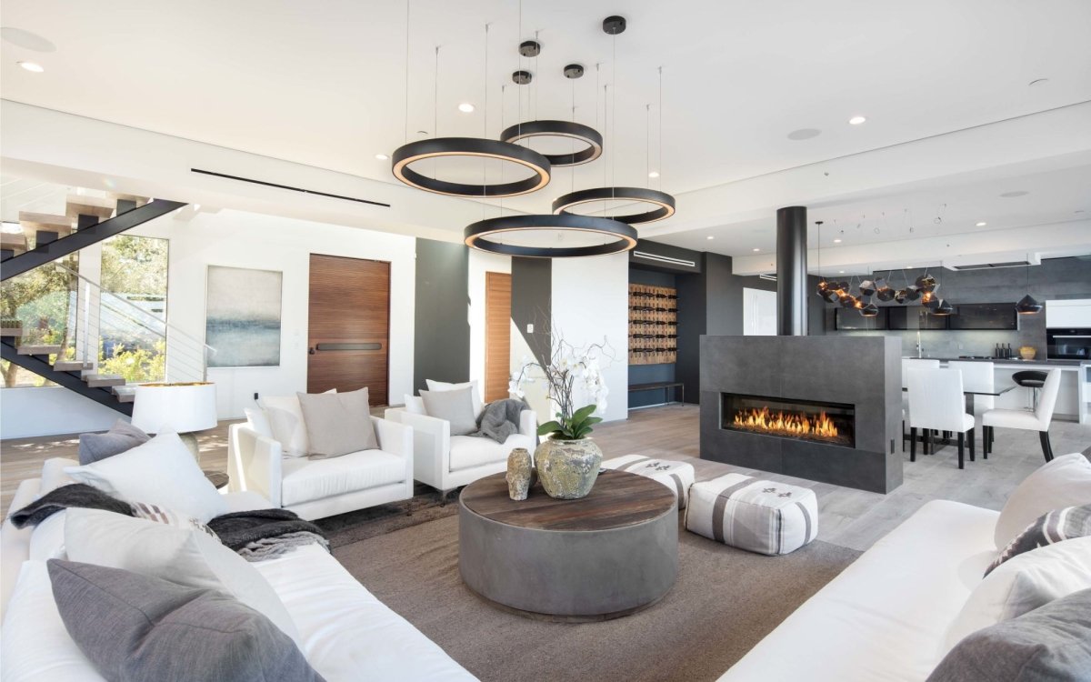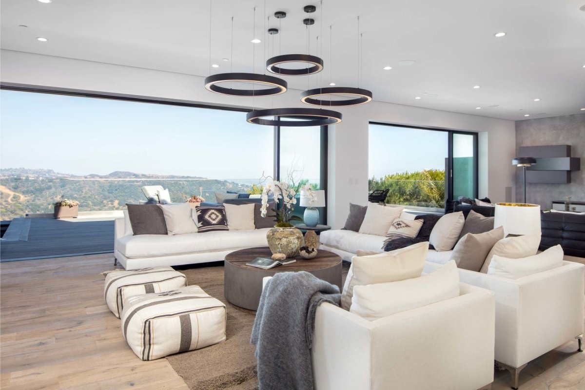Positioned centrally and offering a captivating view of Los Angeles, the family room at Roscomare Rd seamlessly blends sophistication with warm, inviting functionality. The Halo Chandelier, chosen for its modern, celestial design, hangs prominently, mirroring the distant city lights and providing a gentle, ambient illumination to the space below. Its sleek, circular form not only aligns with the client's modern aesthetic preferences but also serves as a striking visual anchor in this pivotal space, enhancing the open, airy ambiance and creating a harmonious convergence of light, design, and shared experiences in the heart of the home.