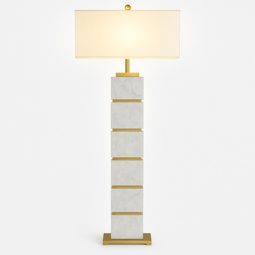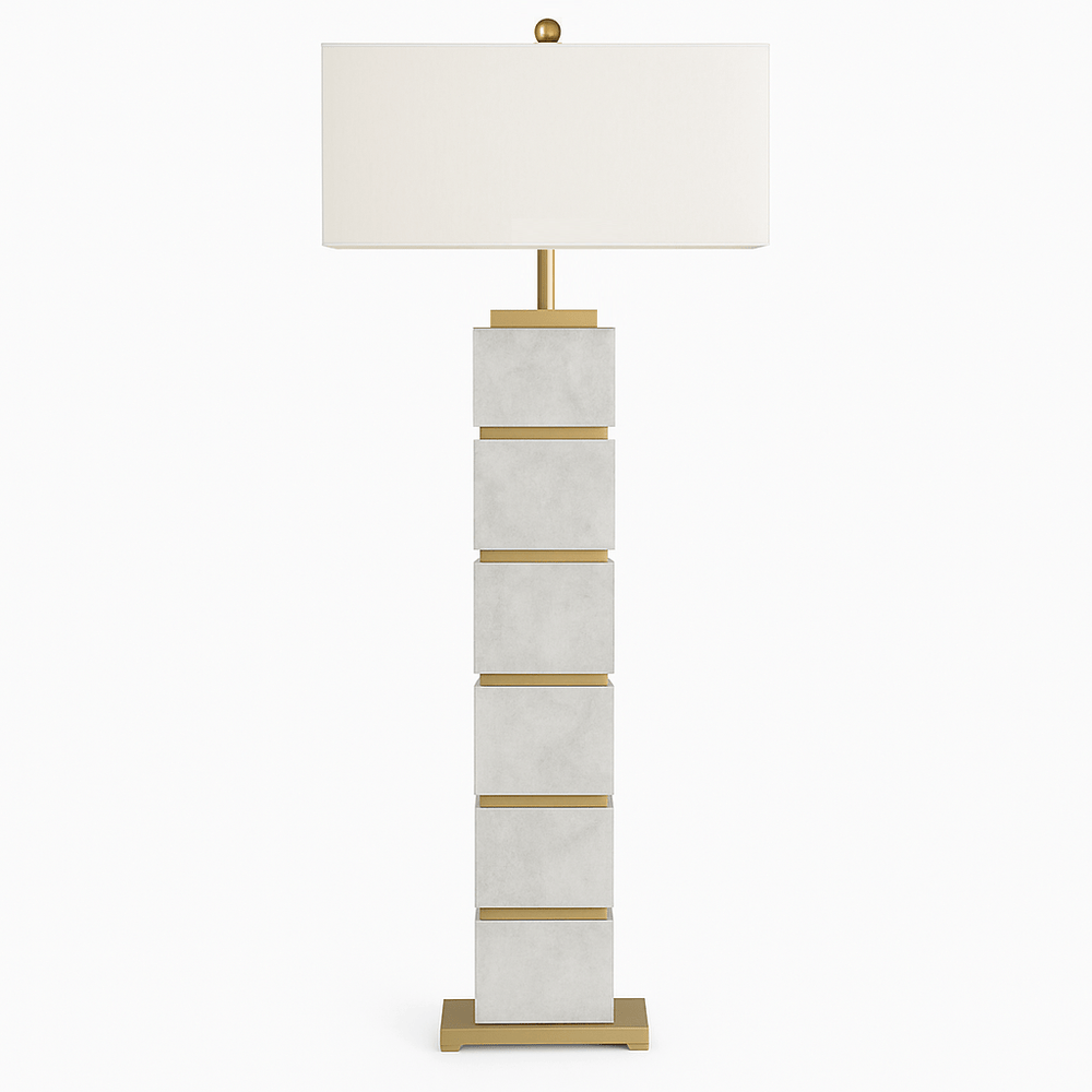 The Amira Floor Lamp is a modern light fixture featuring stacked travertine blocks with gold accents, a sleek iron base, and a rectangular fabric shade for diffused soft lighting. Its clean lines and bold design make it a standout piece ideal for living rooms, bedrooms, or offices. This versatile lamp complements contemporary and minimalist interiors while serving as both a functional and decorative element.