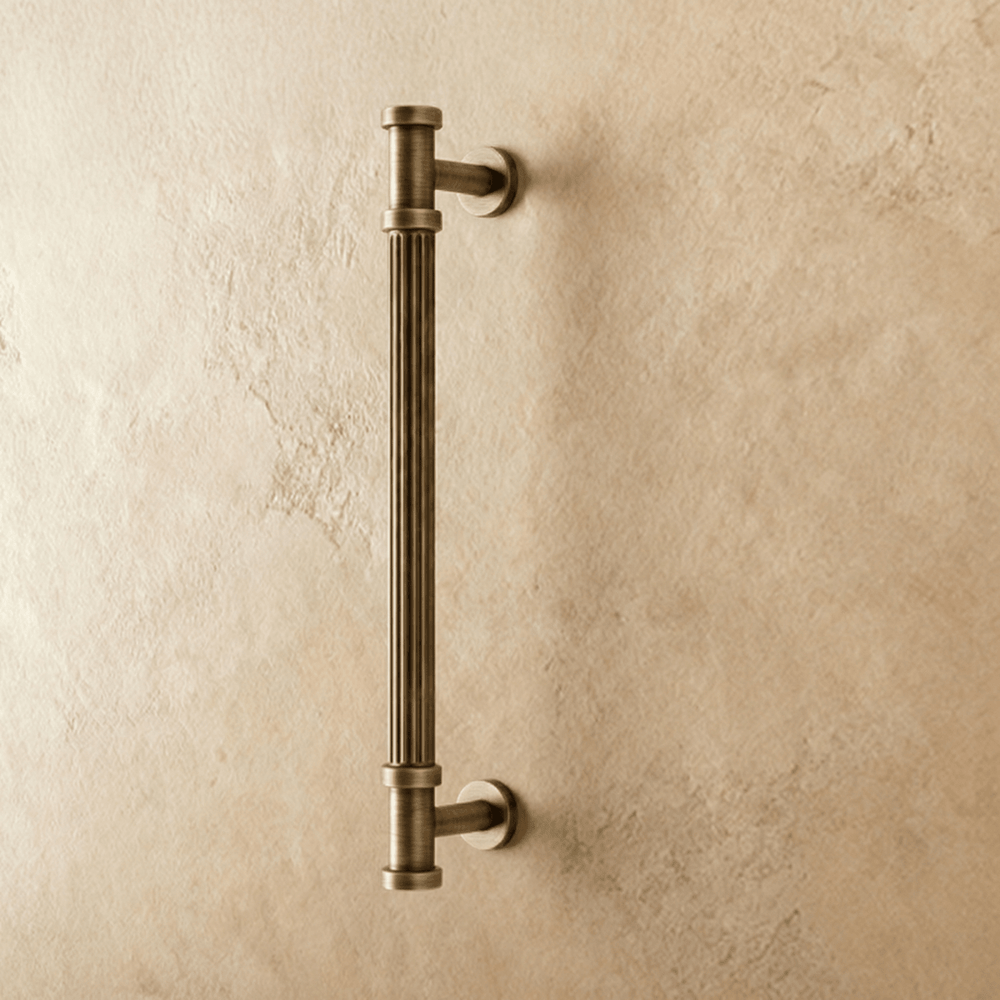 Aque is a brass pull handle featuring a fluted cylindrical design with detailed end caps. Its ribbed texture enhances grip while adding classical charm. The antique brass finish complements vintage and modern interiors alike. Ideal for cabinets, wardrobes, and drawers, it brings a refined, architectural touch to any space.