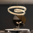 The chandelier showcases a modern two-ring design, creating a dramatic and stylish centerpiece.