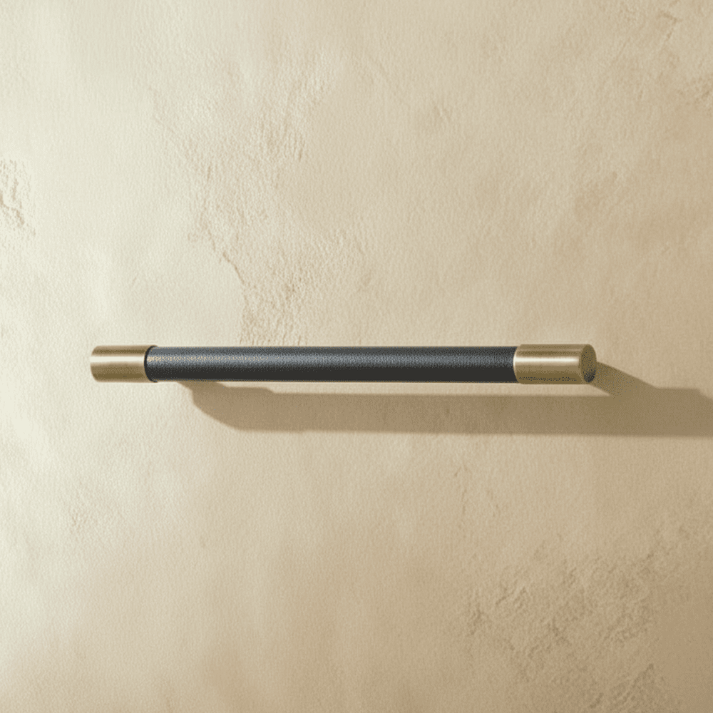 The Arfena knob and pull bar combine brass and premium leather, showcasing a unique blend of durability and elegance. The brass base provides strength, while the leather-wrapped handle adds a refined, textured finish. Featuring a sleek cylindrical design with stitching detail, it is ideal for enhancing cabinets, drawers, and wardrobe doors.