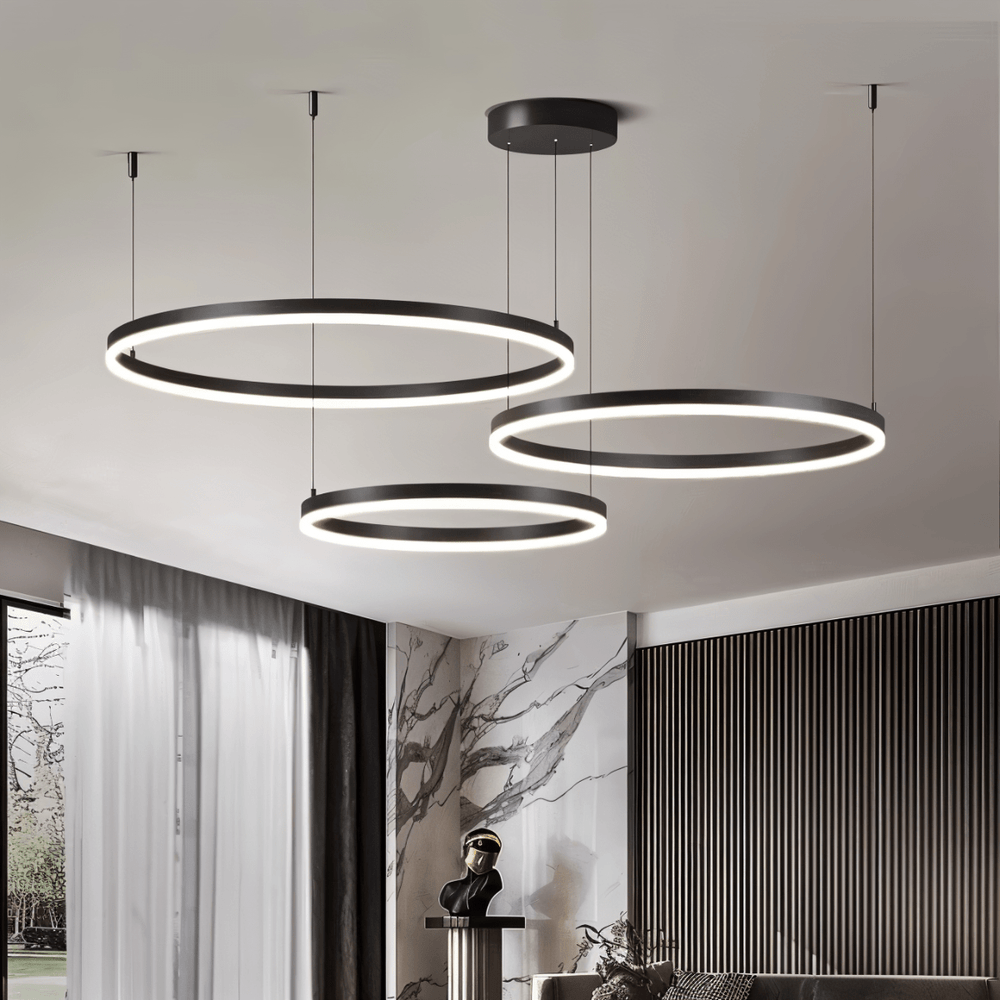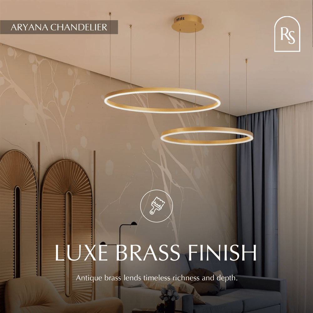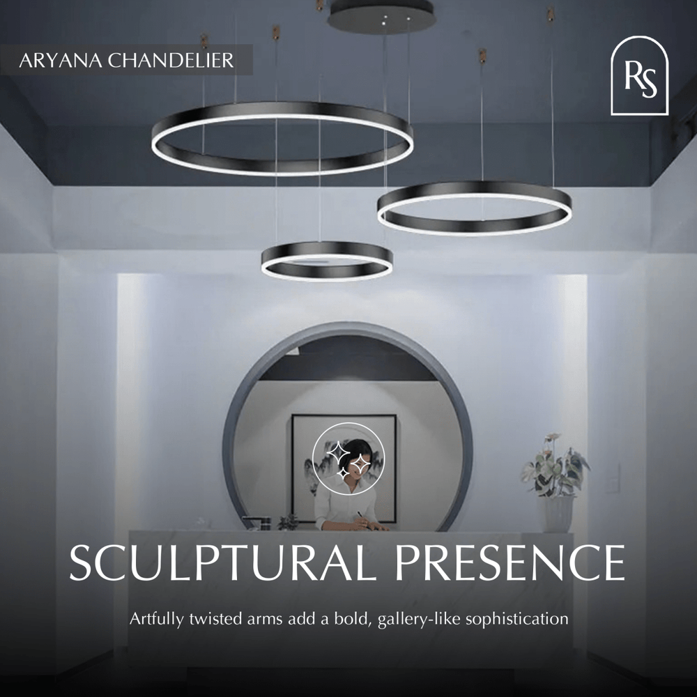 The Aryana Chandelier offers an opulent and modern visual experience. Crafted with precision, this stunning chandelier features rings made from premium iron with LED illumination, emanating a cutting-edge ambiance. Its polished black, white, and gold finishes add a touch of modern luxury. Whether adorning your living room, dining room, or office, the Aryana effortlessly sets itself apart, bestowing a distinctive designer touch that leaves a lasting impression.