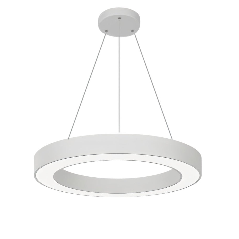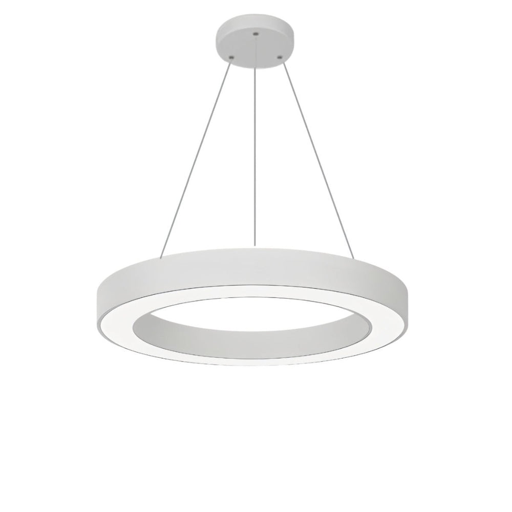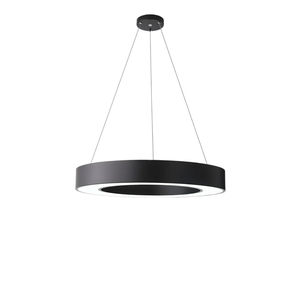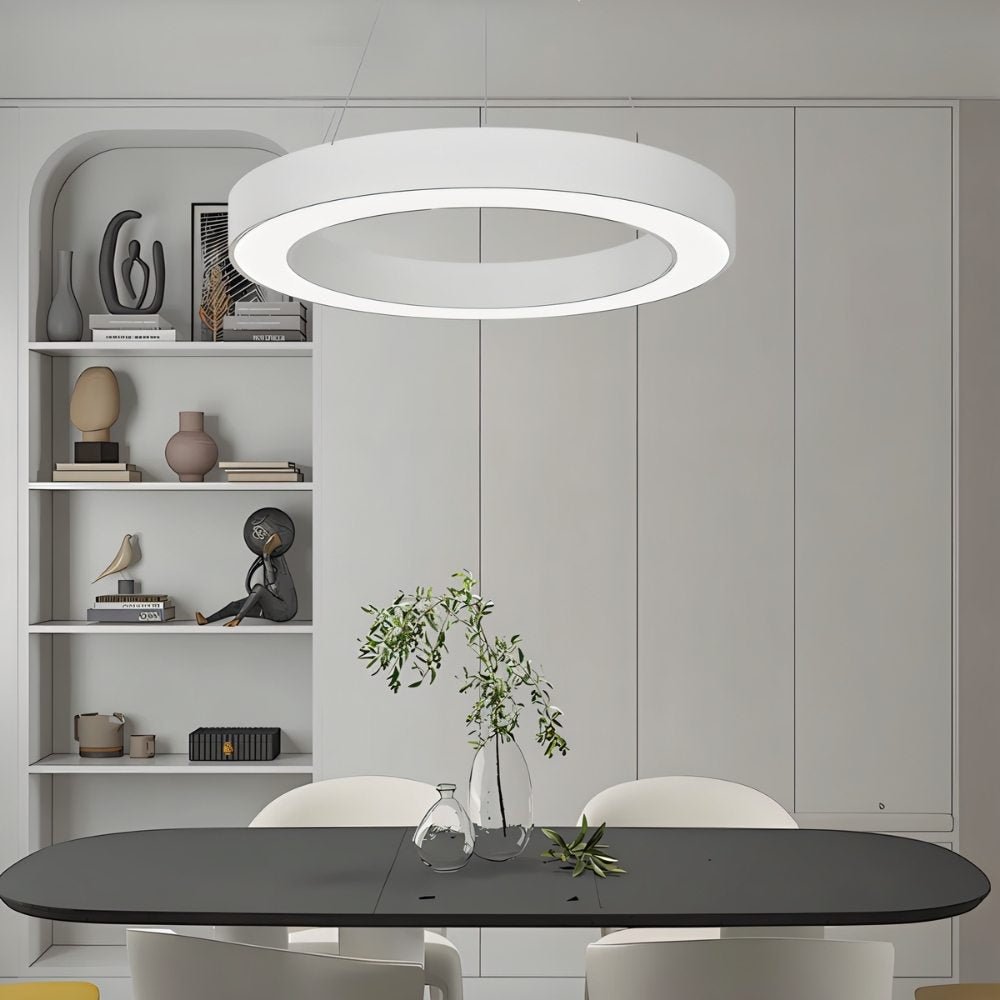 The Attila chandelier is a modern ring-shaped pendant light made from metal and acrylic, featuring an integrated LED source for soft, glare-free illumination. Its floating design suits dining rooms, living areas, kitchens, and offices. The minimalist circular frame enhances contemporary interiors, making it an elegant statement piece for high ceilings and open spaces.