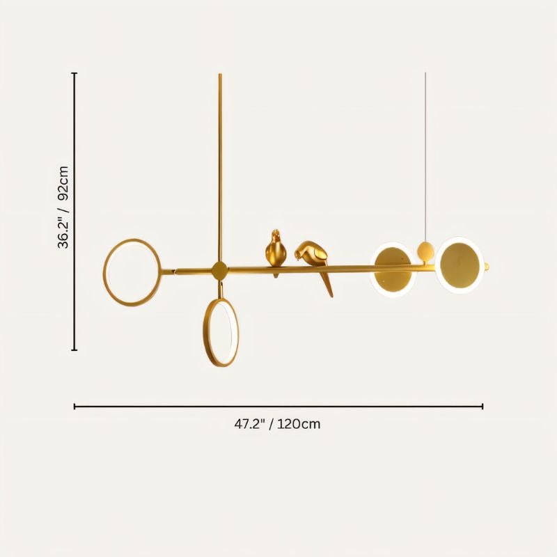 Product Dimensions: L47.2"(120cm) x H36.2"(92cm) Material: Metal, Acrylic Finish: Black, Gold Light Source: Integrated LED Dimmable: Yes (Through Remote Only) Voltage: 90-260VAC Installation Type: Pipe Erected Chain/Cord Length: Up to 35.4 Inches (90cm) Adjustable Cord: No Sloped Ceiling Compatible?: Upon Request Certifications: UL, CCC, CE, CQC, EMC, FCC, GS, LVD, PSE, ROHS, SAA, and VDE