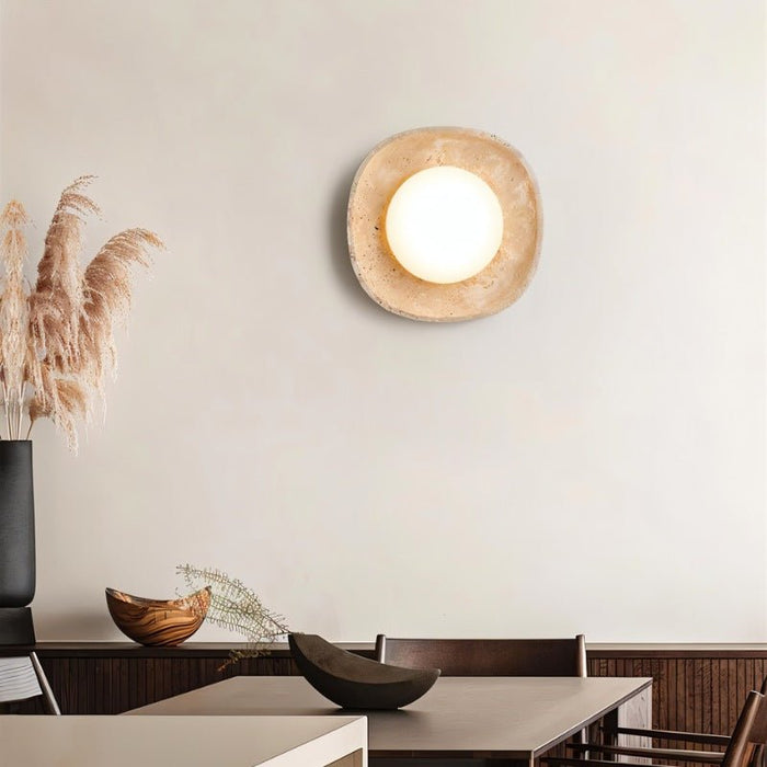The Blipi wall lamp is a sophisticated light fixture that merges natural aesthetics with modern functionality. Crafted from Travertine and plastic, its organic-textured base enhances the ambiance with a warm, diffused glow. The spherical light source creates a soft, inviting atmosphere, making it ideal for living rooms, bedrooms, and hallways. Designed for wall installation, this light fixture serves as a striking decorative element while providing practical illumination. Its minimalist yet earthy appeal complements contemporary and nature-inspired interiors.
