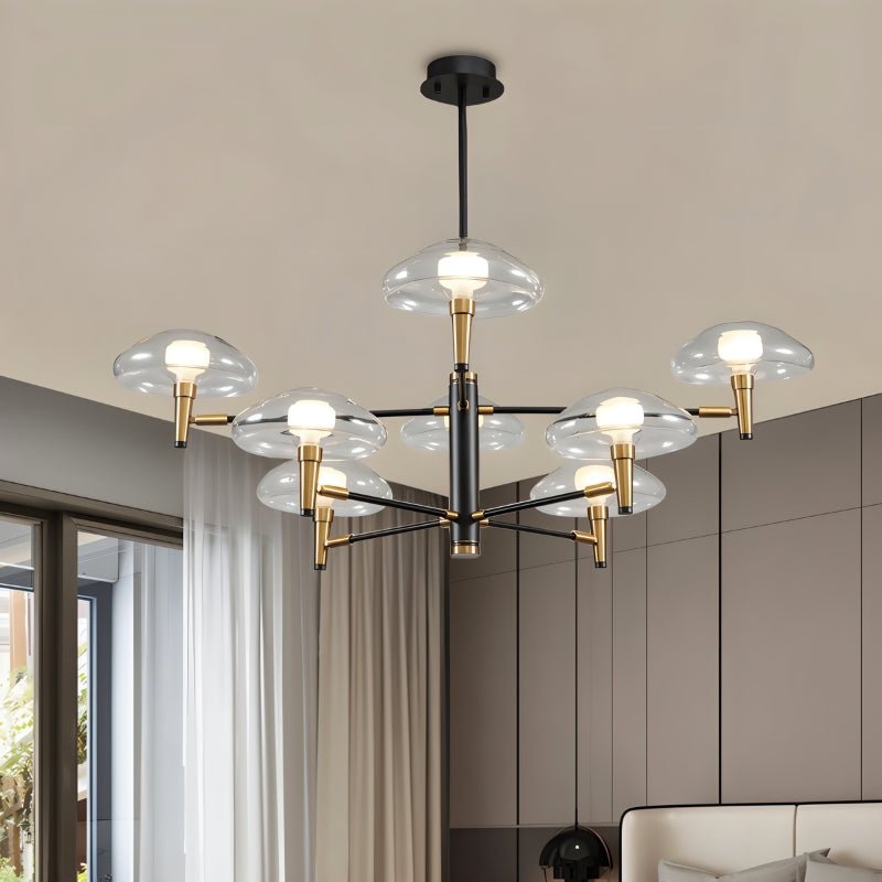 The Brandr Chandelier is a modern light fixture with an iron and metal frame, featuring multiple arms extending outward, each supporting a clear glass shade for even illumination. The black and brass finish enhances its contemporary appeal, making it ideal for living rooms, dining areas, and upscale bedrooms. Designed for high ceilings, it seamlessly fits modern, industrial, and transitional interiors. This statement light fixture adds both functionality and striking visual impact.