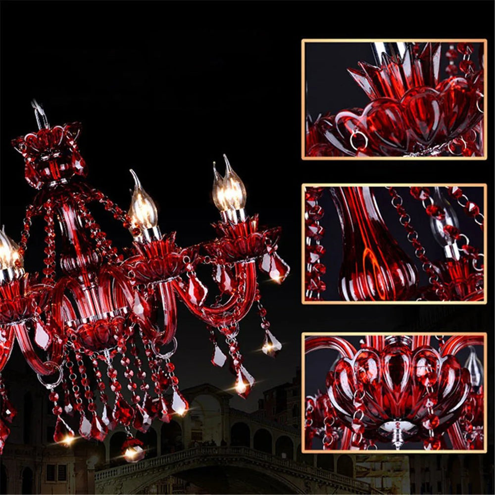 Material: Crystal, Metal Finish: Red Light Source: LED Light Bulb (replaceable) Bulb Included: Yes Number of Bulbs: 6, 8, 18 Bulb Base: E14 Dimmable: No Voltage: 90-260VAC Installation Type: Hardwired Chain/Cord Length: Up to 11.8 Inches (30cm) Adjustable Cord: No Canopy/Backplate Dimensions: D4.7"(12cm) Sloped Ceiling Compatible?: Upon Request Certifications: UL, CCC, CE, CQC, EMC, FCC, GS, LVD, PSE, ROHS, SAA, and VDE