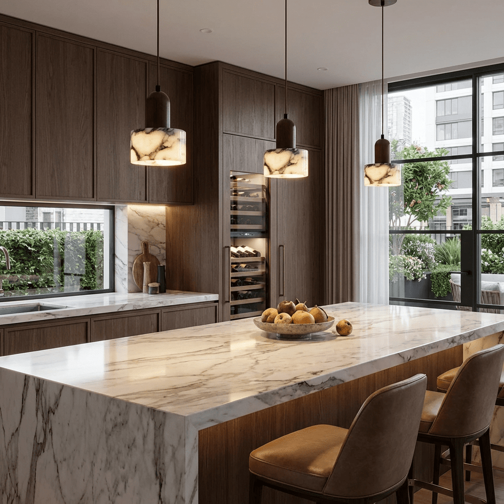 Natural stone diffuses light into a warm, even halo ideal for islands and dining tables.