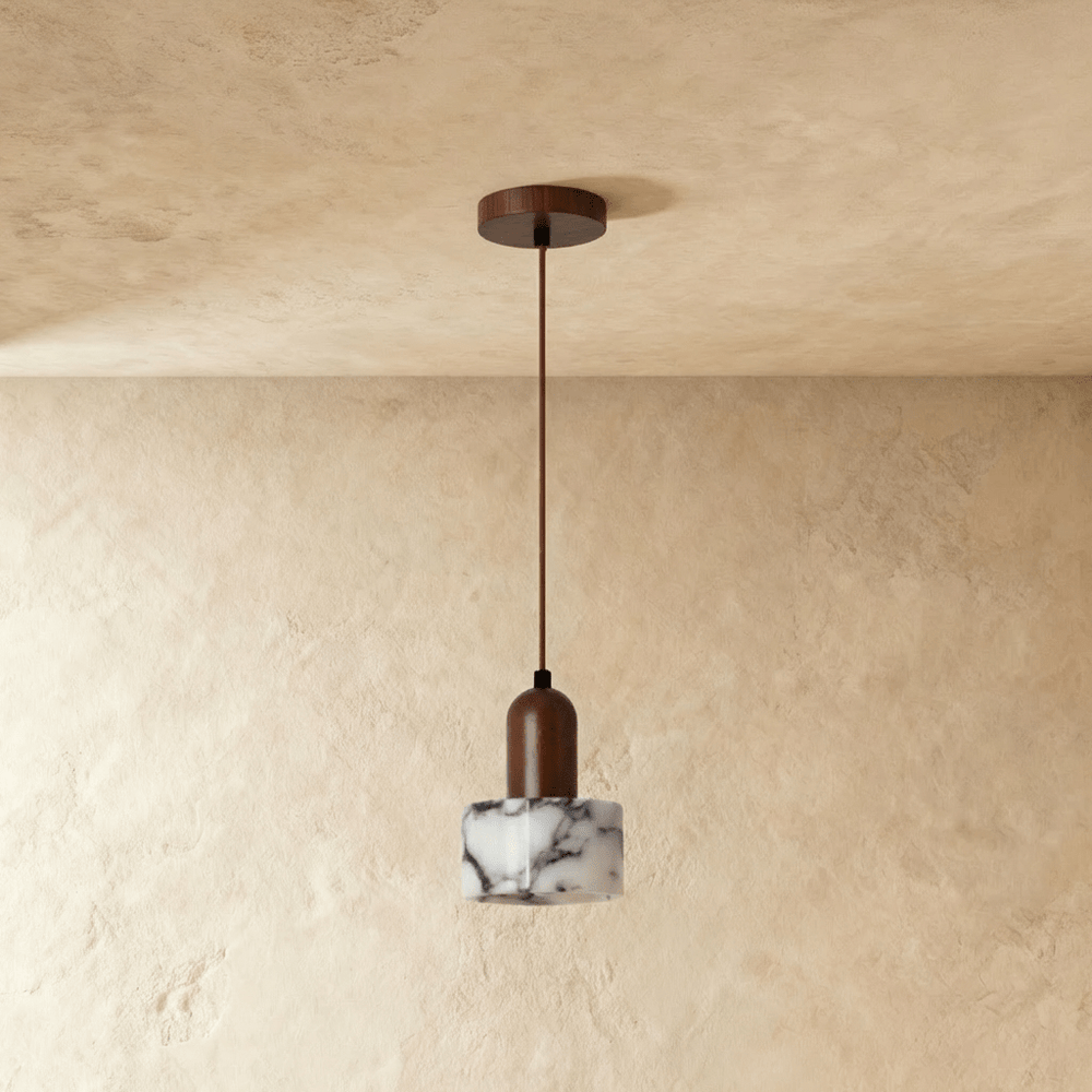 The Calma Pendant Light is available in a single refined finish, featuring a warm wood canopy paired with a naturally veined stone shade.