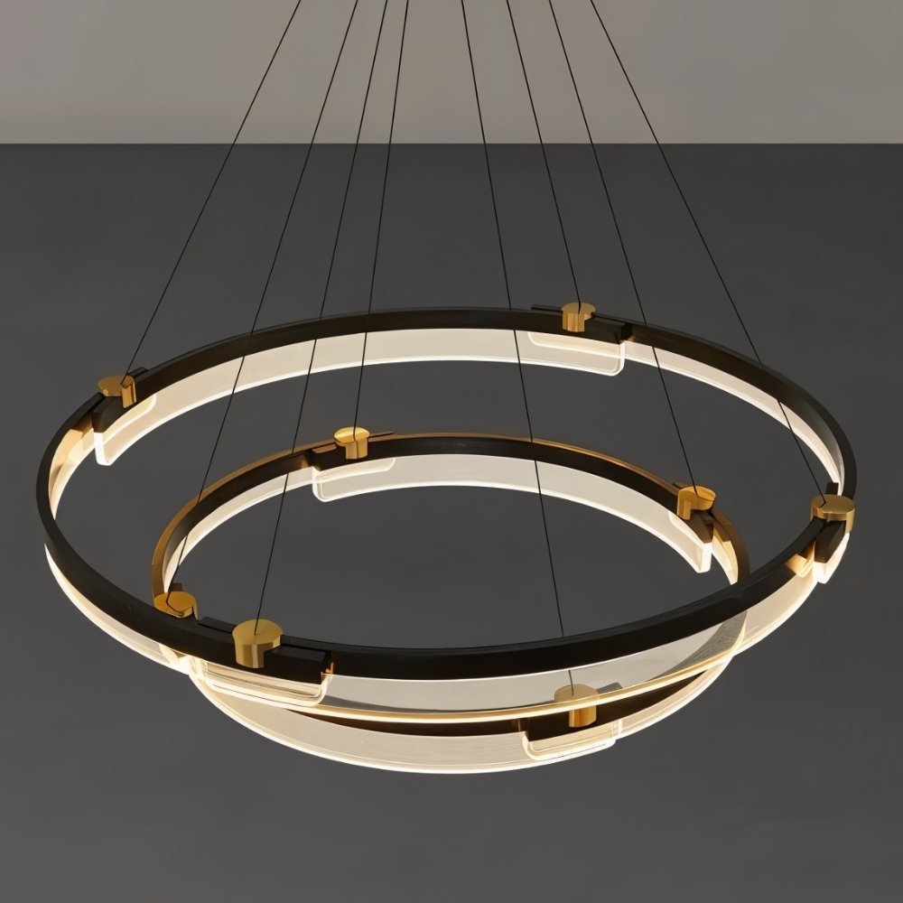 The Capli chandelier is a contemporary light fixture featuring dual aluminum rings with integrated acrylic diffusers, creating a striking floating effect. The sleek, suspended design offers a perfect balance of modern minimalism and sculptural elegance. Its warm, evenly distributed illumination enhances the ambiance of living rooms, dining spaces, and high-ceiling interiors. The durable aluminum frame ensures longevity, while the acrylic accents add a refined touch.