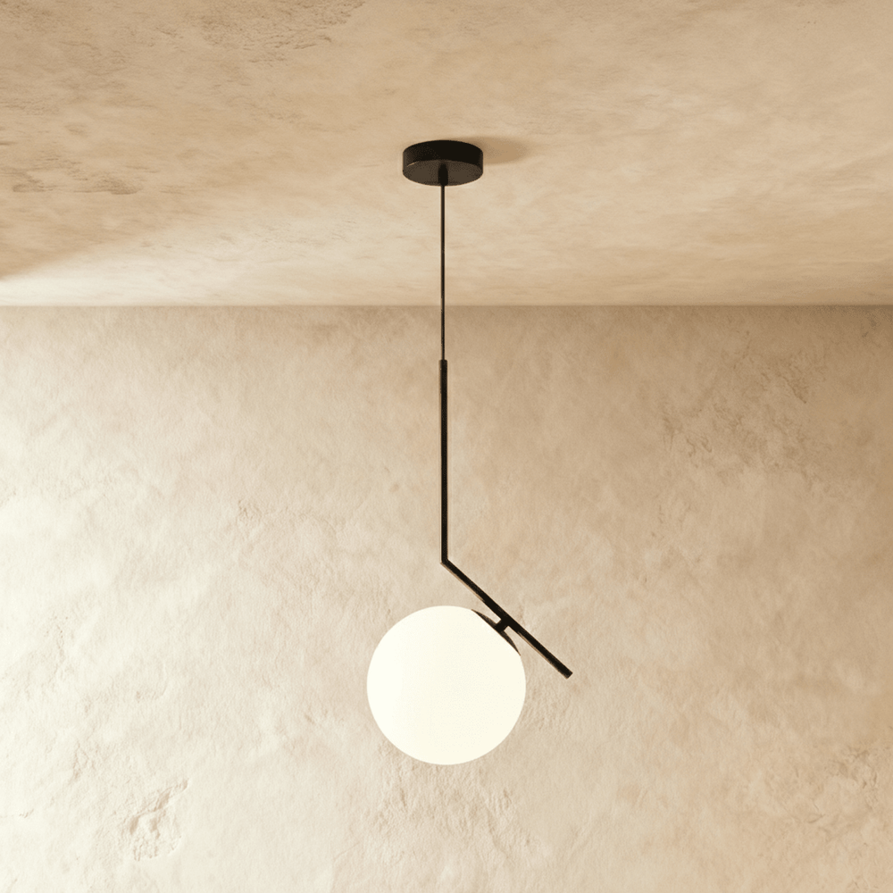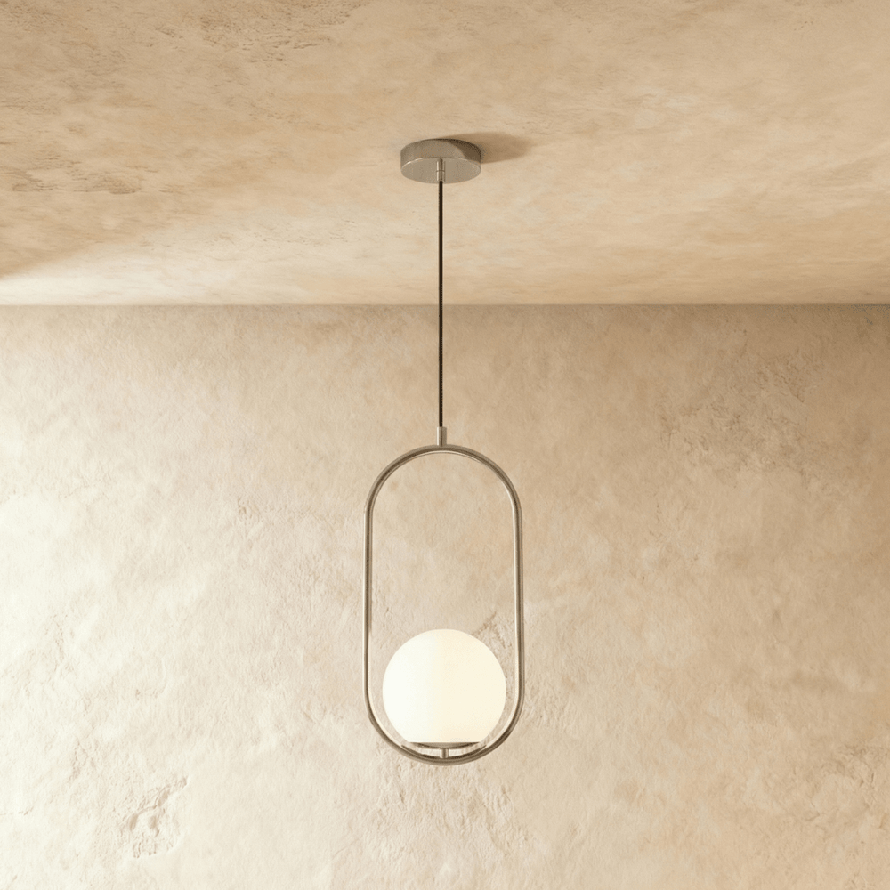 Iron and glass pendant enhances modern spaces with layered lighting — perfect for residential or commercial settings. Choose from brass, black, or chrome finishes.