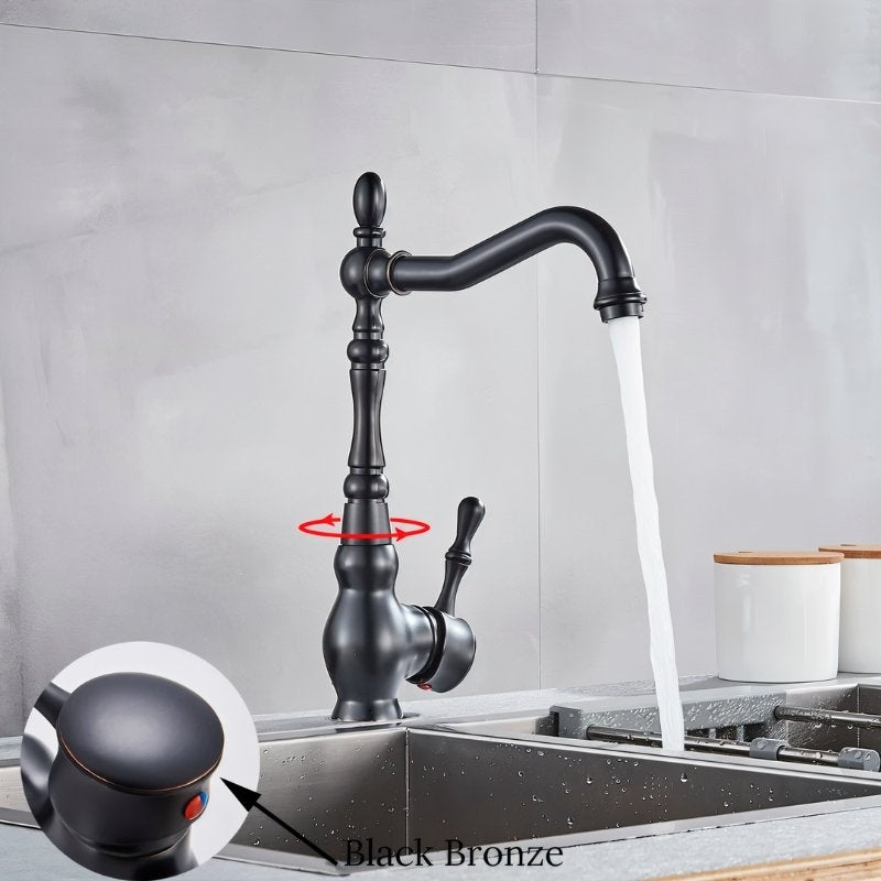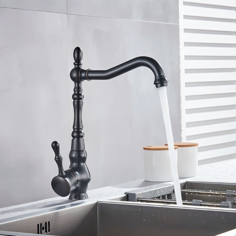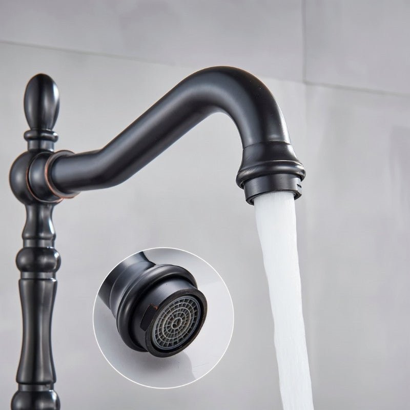 Daped kitchen faucet features a striking design with a blend of vintage charm and modern functionality. Constructed from durable brass, this faucet boasts a matte black finish that complements contemporary kitchen aesthetics. Its high-arc spout, adorned with intricate, traditional detailing, allows for ample clearance and ease when filling larger pots or washing produce.