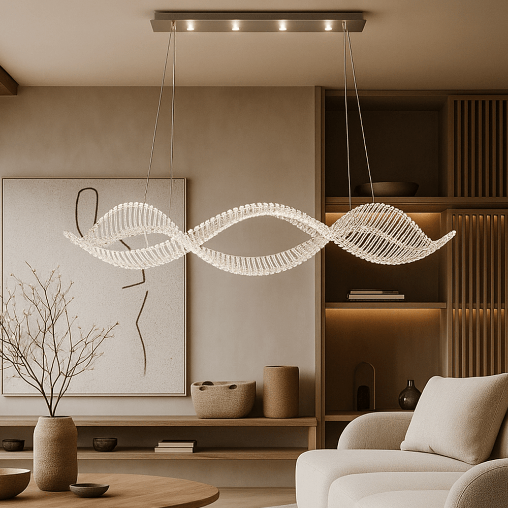 The Dumini Chandelier's glamorously modern style will add timeless elegance to your decor. It showcases a brushed stainless steel frame with a chrome or gold-plated finish, a noteworthy undulating form, and a plethora of crystals that glimmer brilliantly when the light shines upon them. Dumini provides your area with an extravagant feel, allowing you to walk around and appreciate its beauty and fineness. It will look stunning installed above a dining table, or in the center of a living room or bedroom.