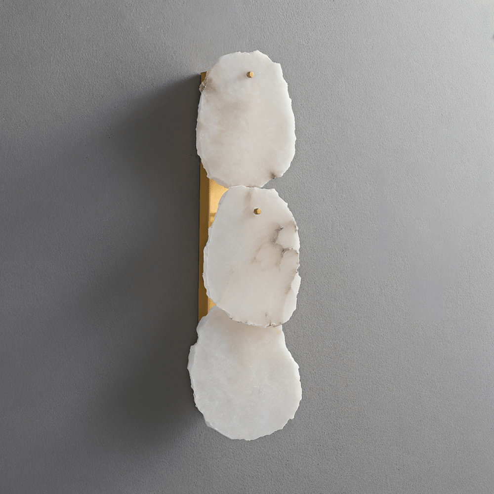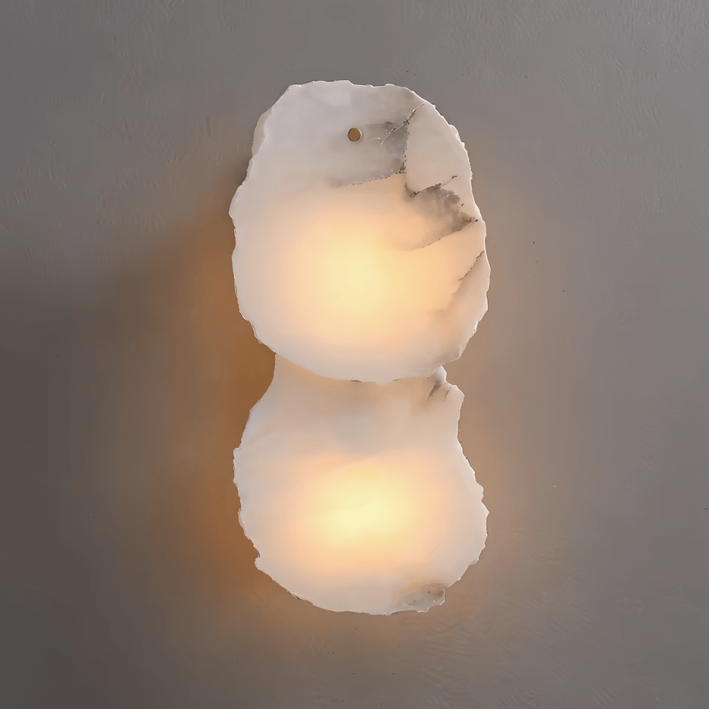 The Elora wall lamp is a sophisticated light fixture made from copper and alabaster marble, combining natural stone with sleek metallic accents. Its sculptural design features cloud-like clusters that diffuse light evenly, creating a warm and ambient glow. The blend of smooth alabaster marble and polished copper adds a timeless yet modern appeal. Perfect for living rooms, bedrooms, or hallways, this wall lamp works as both functional lighting and a decorative statement piece.