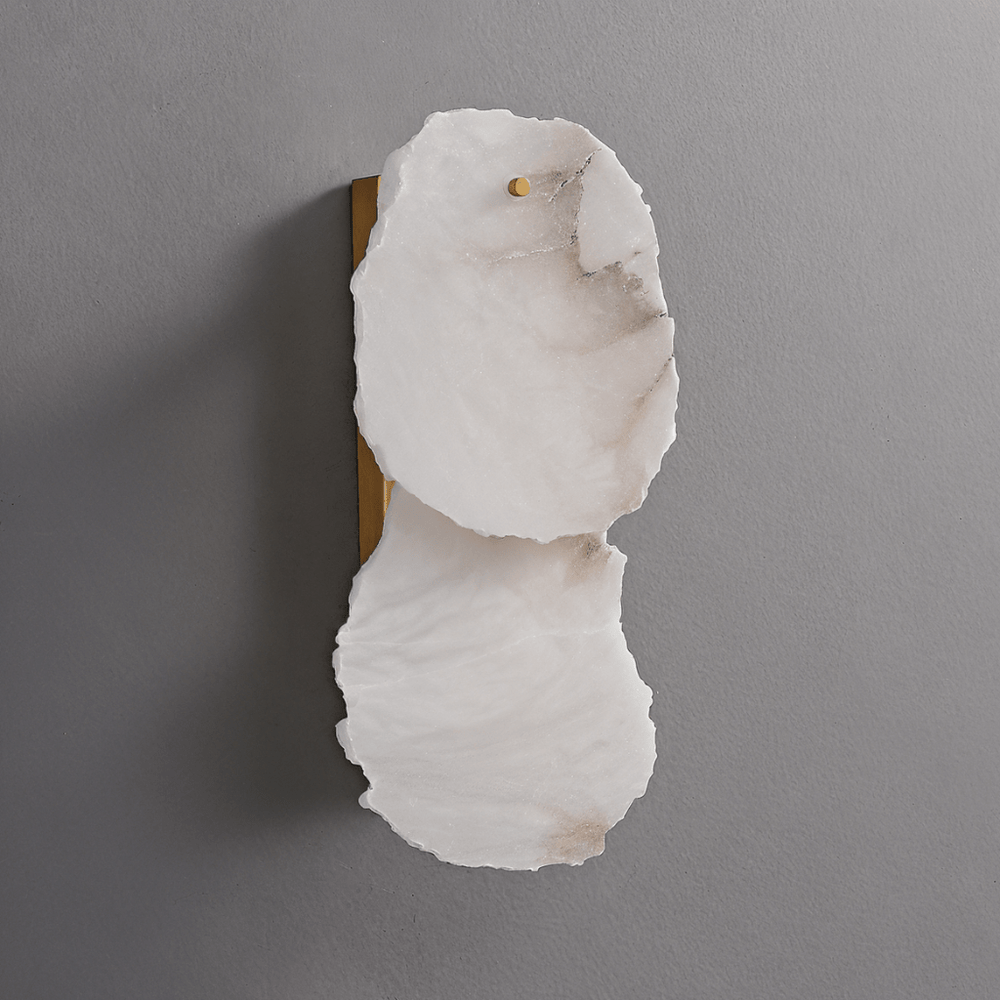 The Elora wall lamp is crafted from premium copper and alabaster marble, blending natural stone with metallic elegance for a timeless design.