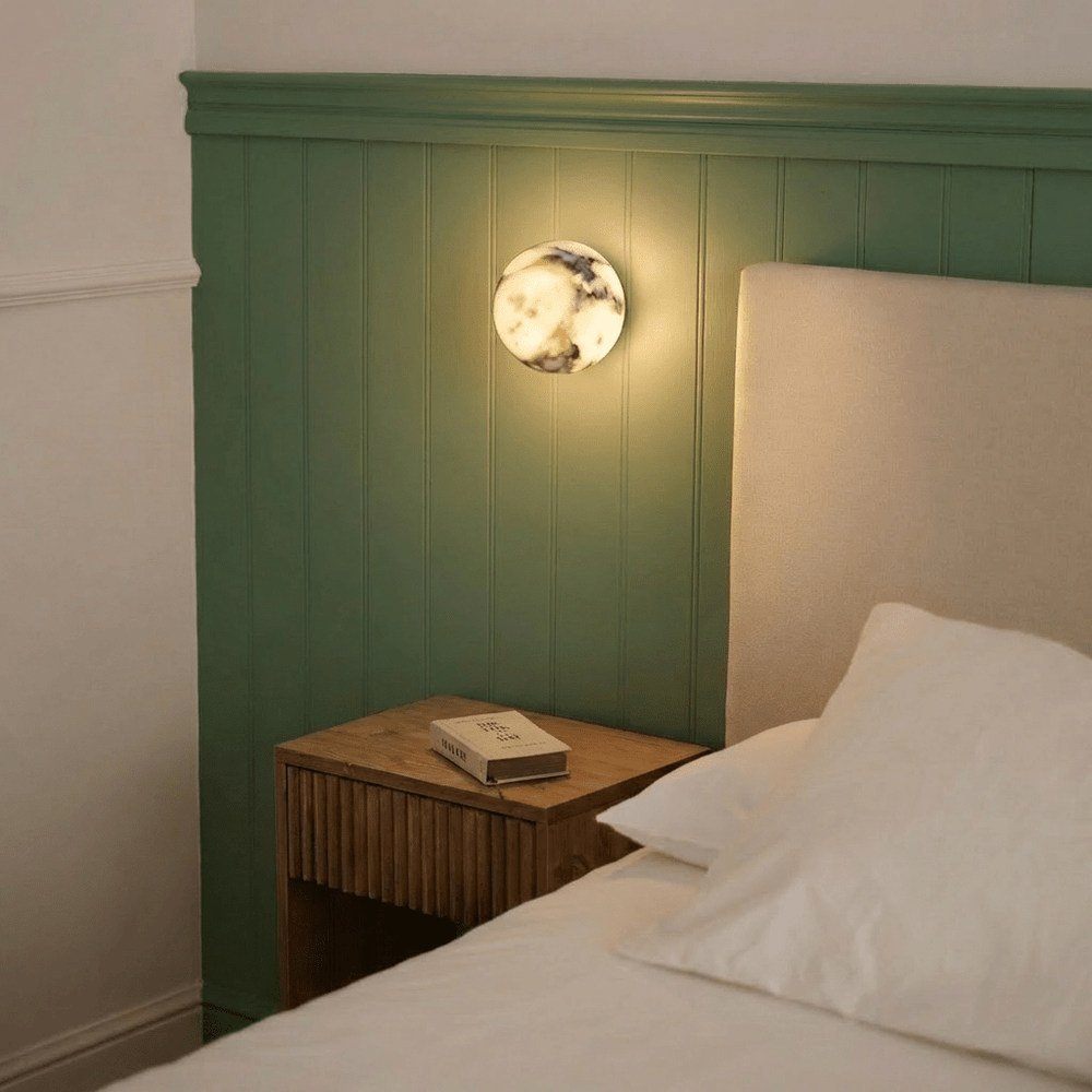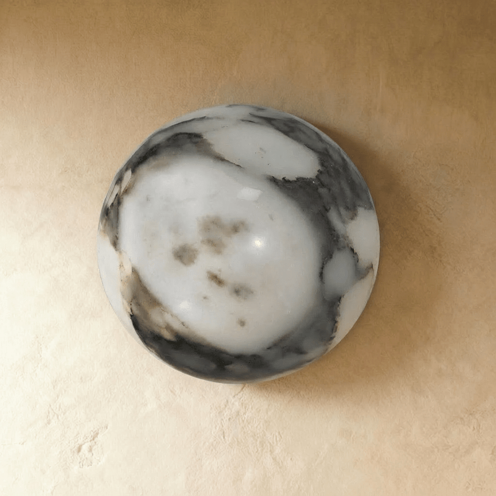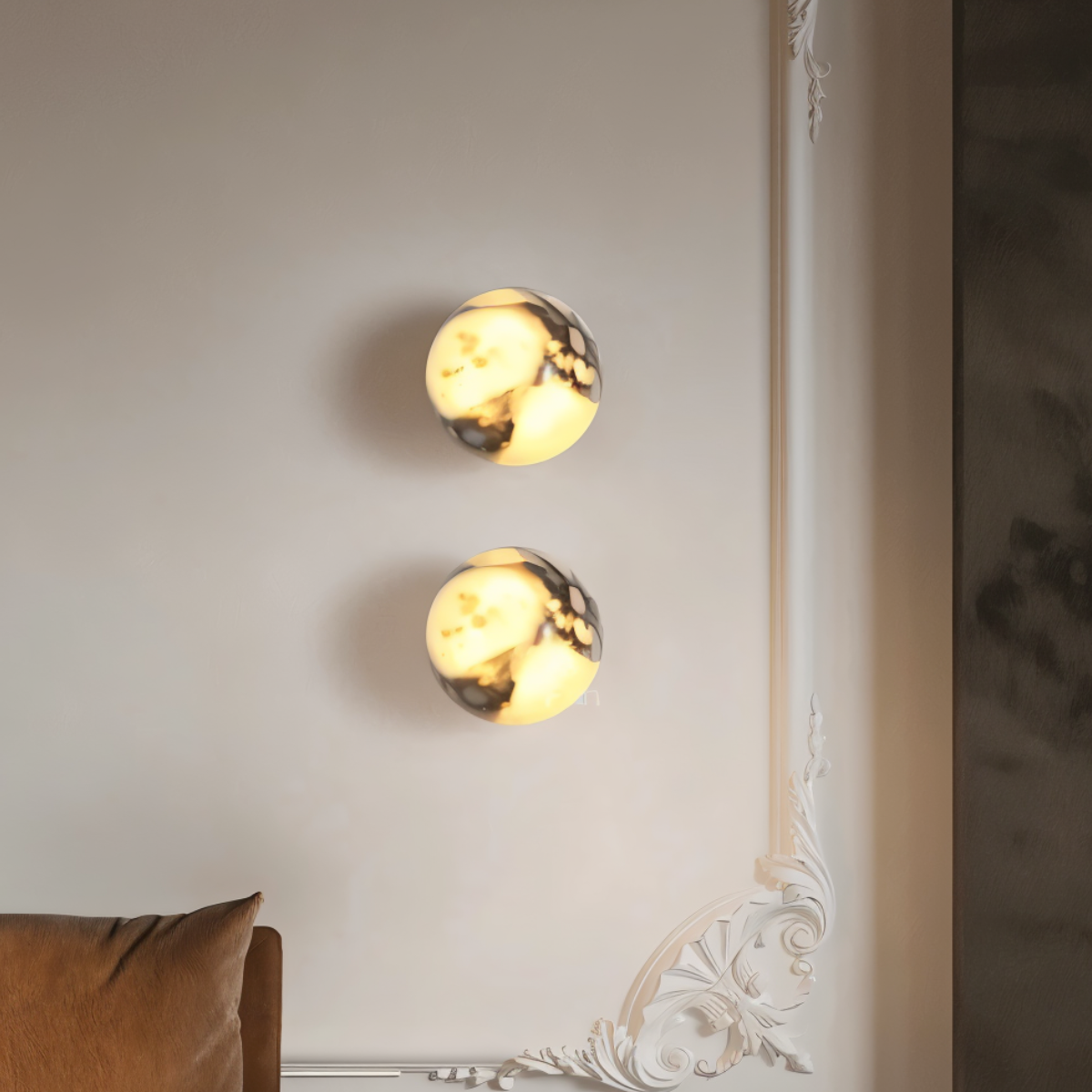 Elune Wall Lamp casts a warm halo at eye level, turning quiet walls into a source of calm. Carved from stone, its organic sphere diffuses light through subtle mineral variations, creating a soft, atmospheric glow. In the bedroom, living room, or dining room, it settles the mood and draws conversation inward. The effect is intimate and architectural, grounding the space while gently shaping how it feels to be in it.