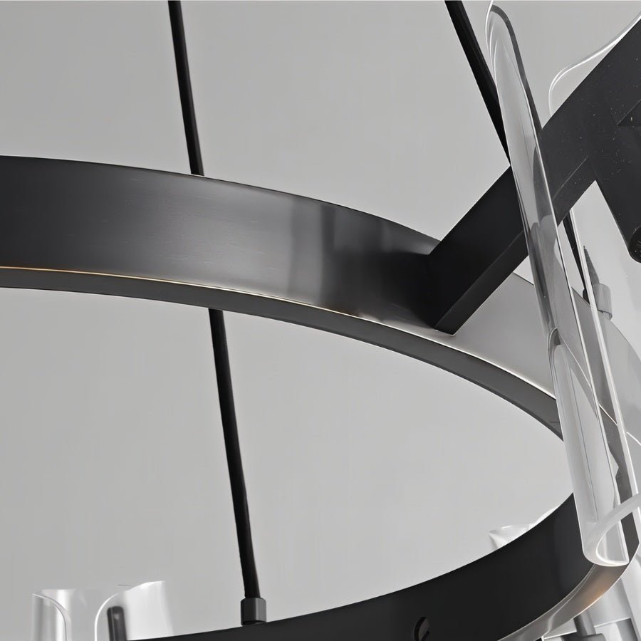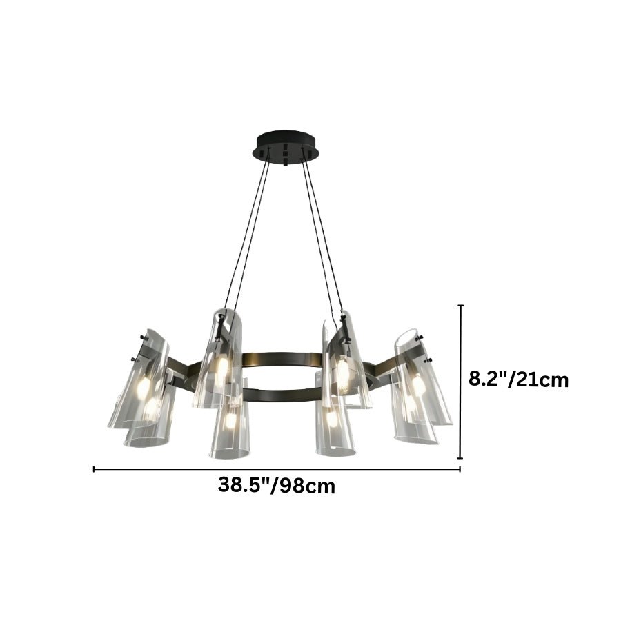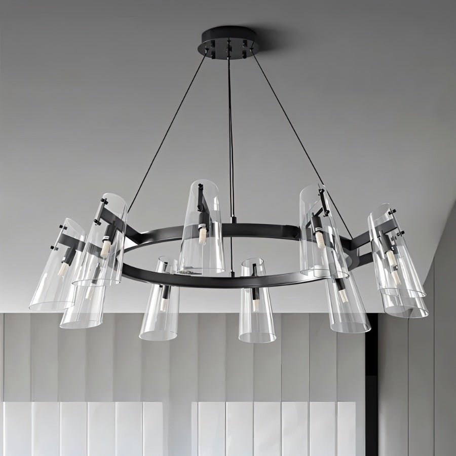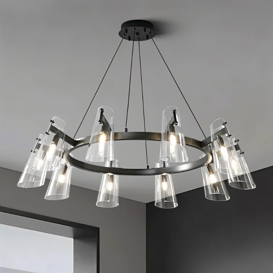 The Elysta Chandelier is a striking light fixture crafted from premium copper and acrylic, featuring a bold circular frame suspended elegantly by minimalist black rods. Its six conical clear acrylic shades create a refined geometric silhouette while providing a warm, focused glow. Perfect for modern dining rooms, living spaces, or entryways, this chandelier delivers a contemporary statement without overwhelming the decor. The airy design enhances visual openness, making it ideal for high ceilings. This light fixture seamlessly combines sculptural art with functional illumination for an upscale, sophisticated interior.