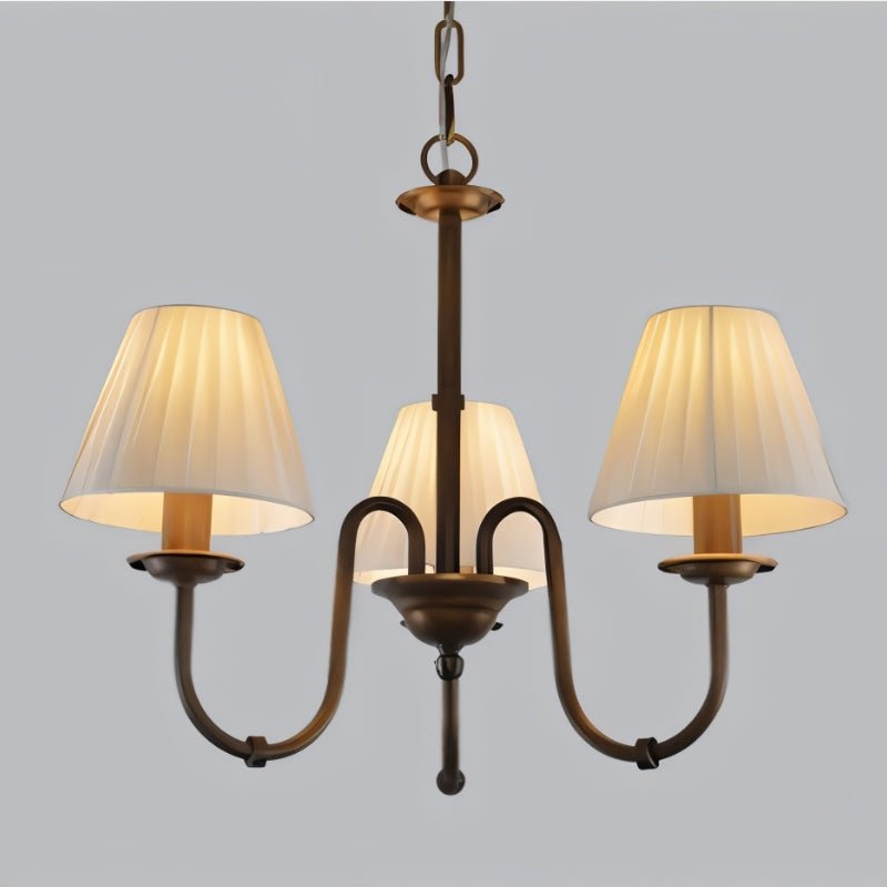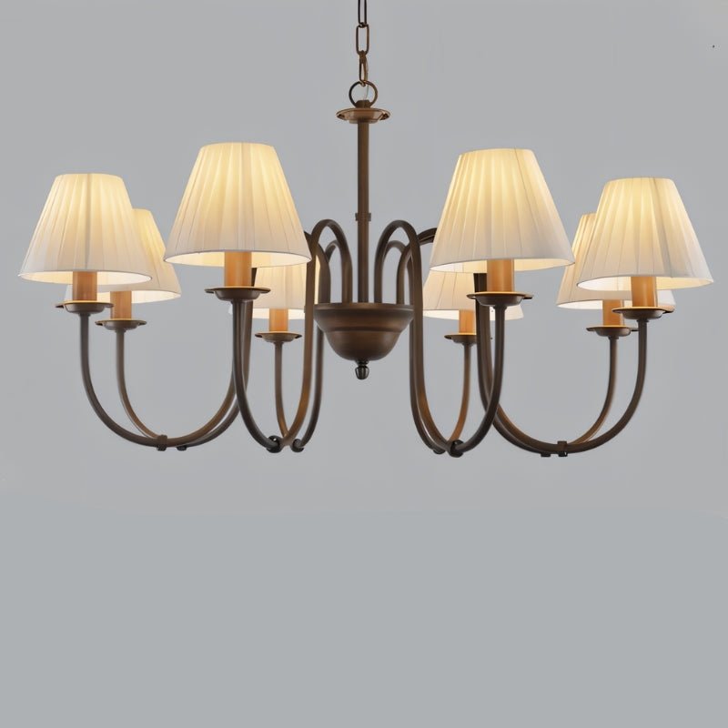 The Elyxia Chandelier is a timeless light fixture made from durable metal. It features elegantly curved arms and six pleated fabric shades for a warm, diffused glow. Its symmetrical design makes it a striking centerpiece for dining rooms, living spaces, foyers, and bedrooms. The adjustable chain allows for versatile installation at various ceiling heights. Blending traditional aesthetics with modern craftsmanship, this light fixture enhances any refined interior.