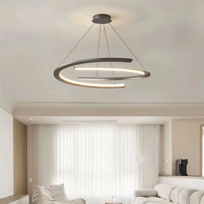 The Fiona Chandelier is a modern light fixture made from aluminum and iron, featuring asymmetrical, layered rings that create a floating effect. Its sleek cables suspend the design, diffusing warm LED illumination for a striking visual impact. Ideal for living rooms, dining areas, and open spaces, it enhances modern, industrial, and minimalist interiors. The bold geometric structure makes it a standout focal point in contemporary settings.