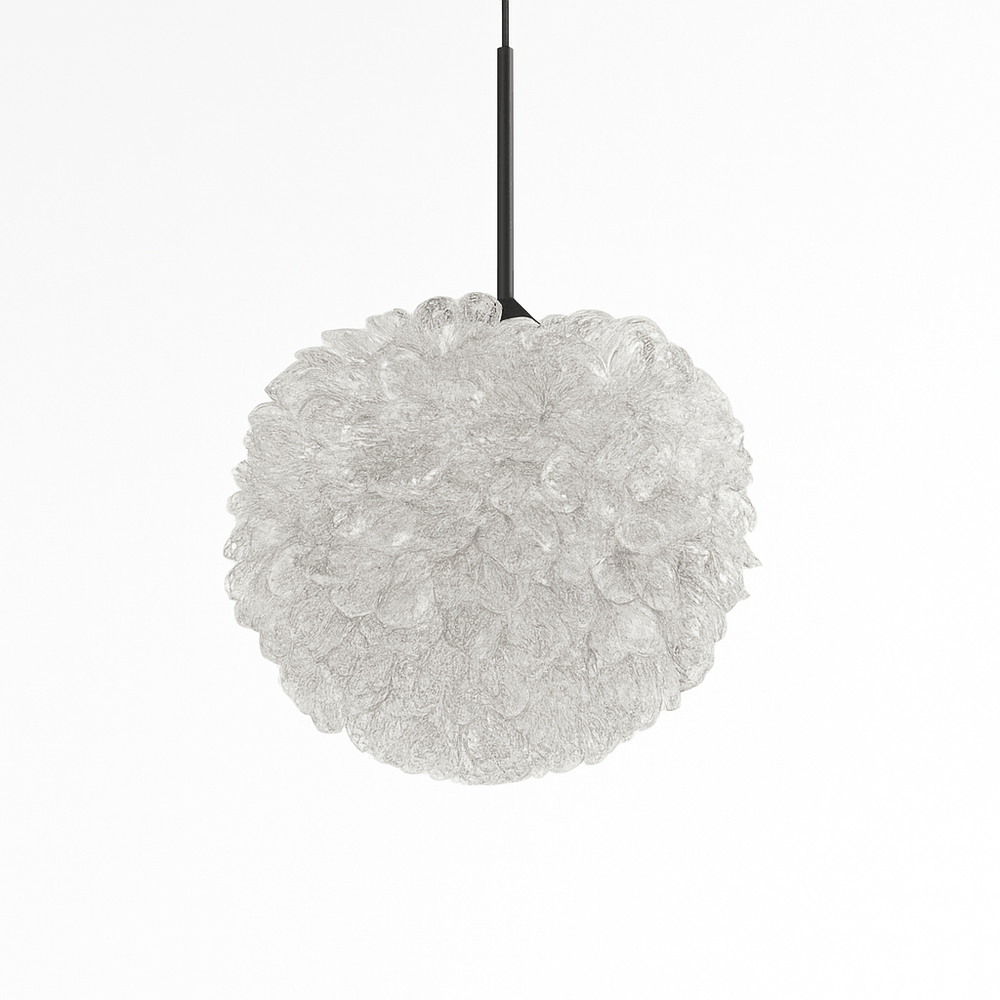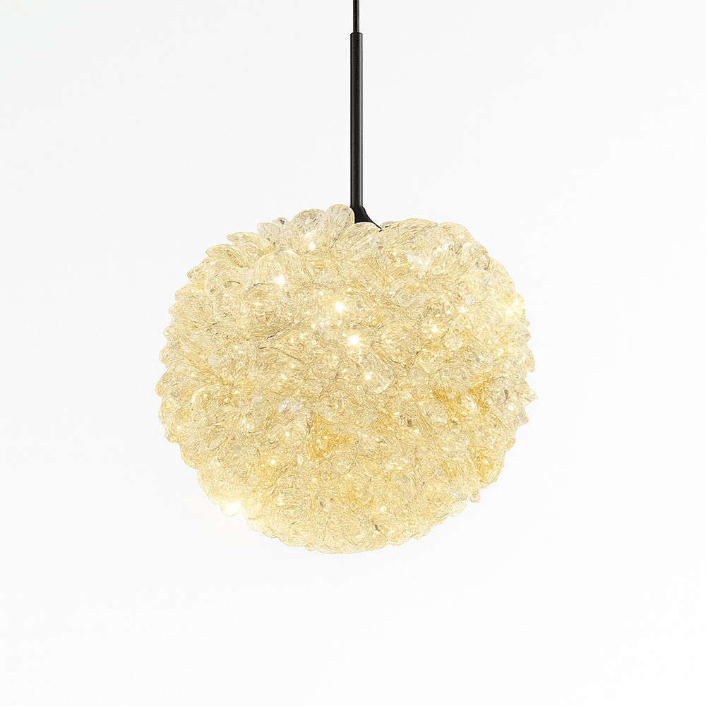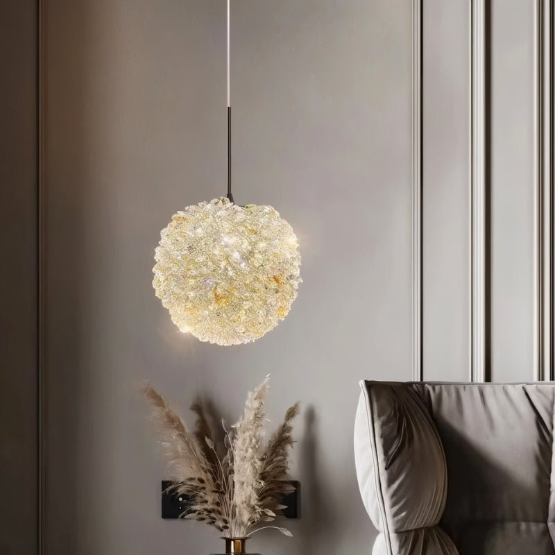 The Fyrin Pendant Light is a spherical aluminum and Crystal light fixture featuring a textured, crystalline surface that emits a warm, ambient glow. Its artistic design, resembling blooming clusters, complements modern and contemporary interiors. Ideal for living rooms, dining areas, or entryways, this pendant enhances spaces with its soft illumination. Its suspended, minimalist design suits both high ceilings and cozy, intimate settings.