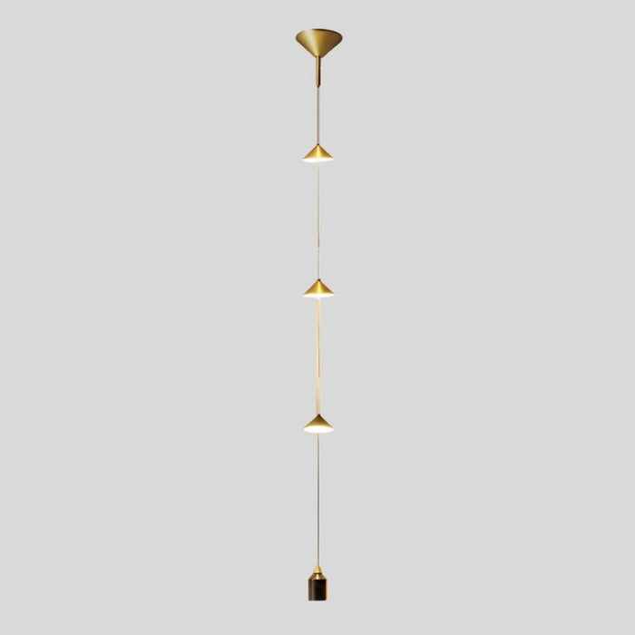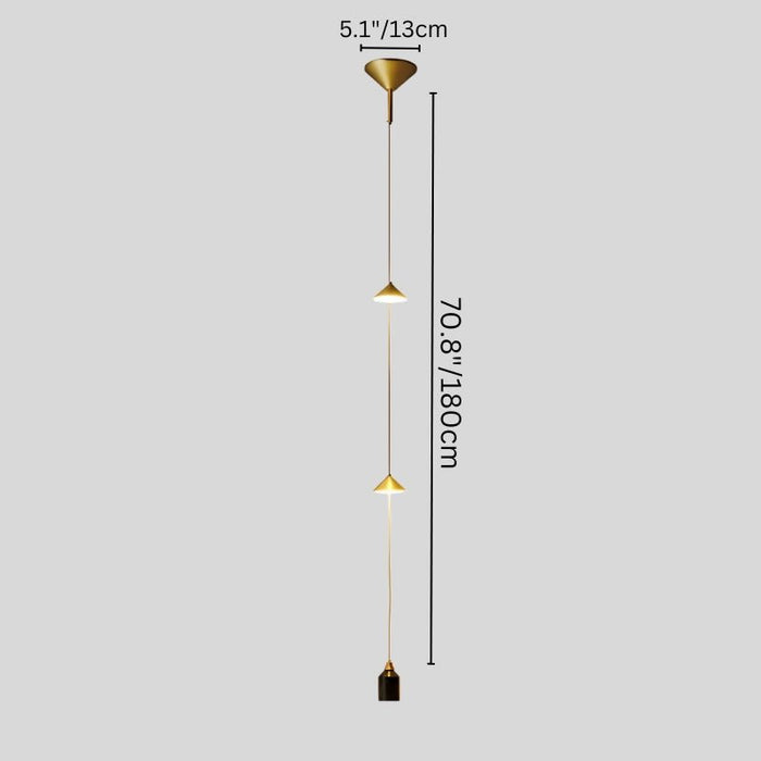 The Hadiya Pendant Light showcases a sleek vertical design with dual-cone metal elements and a weighted cylindrical base for balance. Emitting ambient illumination, this modern light fixture is ideal for bedside installations, reading nooks, or minimalist interiors. Its geometric form enhances contemporary spaces, offering both functional and decorative lighting. Crafted from metal and iron, it delivers a refined yet practical statement in any setting.