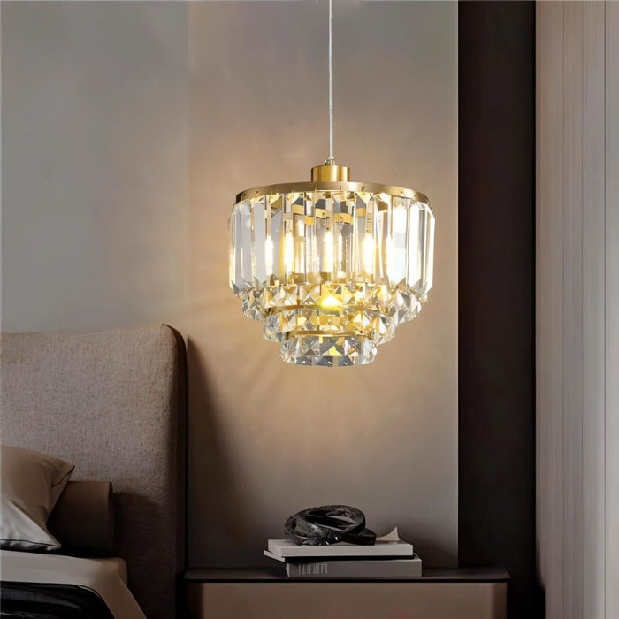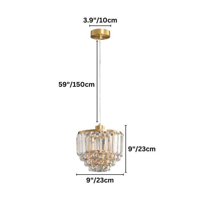 The Hylona Pendant Light blends luxury and functionality, showcasing a durable brass frame that exudes timeless elegance. Its tiered design features meticulously cut crystal elements, cascading gracefully to enhance light refraction and create a dazzling visual display. Perfect for upscale interiors, this brass and crystal pendant light elevates bedrooms, hallways, or any space where a touch of refined luxury is desired.