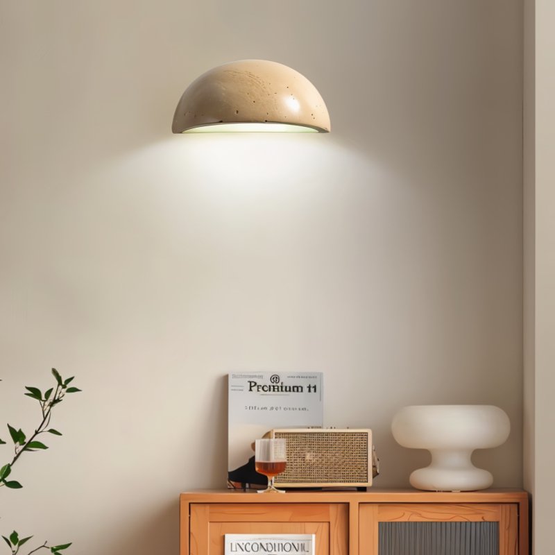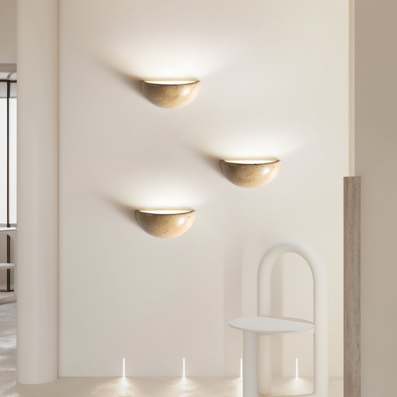 The Ivado travertine wall lamp features a minimalist, semi-circular design crafted from luxurious yellow travertine. Its smooth surface and organic texture create a warm, inviting glow, enhancing any room with a natural ambiance. The neutral stone finish complements modern, rustic, and minimalist interiors. Ideal for bedrooms, corridors, or living spaces, the lamp blends effortlessly with various décor styles.