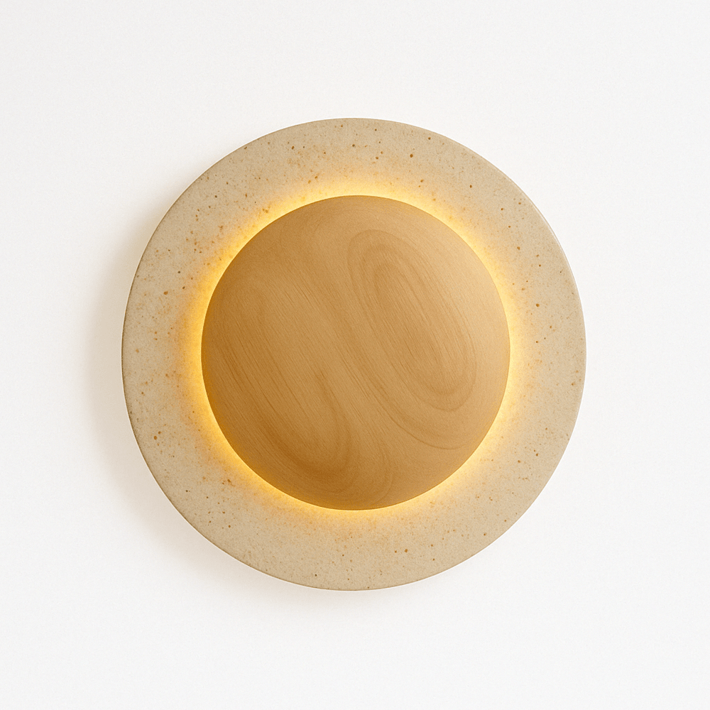 The Jenal Wall Lamp is a sculptural light fixture that combines organic travertine stone with modern lighting. It features a circular stone frame with a recessed wooden core, creating a striking contrast in texture and form. The soft perimeter glow provides warm, indirect illumination, enhancing ambiance without glare. Designed for contemporary interiors, it suits hallways, bedrooms, and lounge spaces in both residential and hospitality settings.