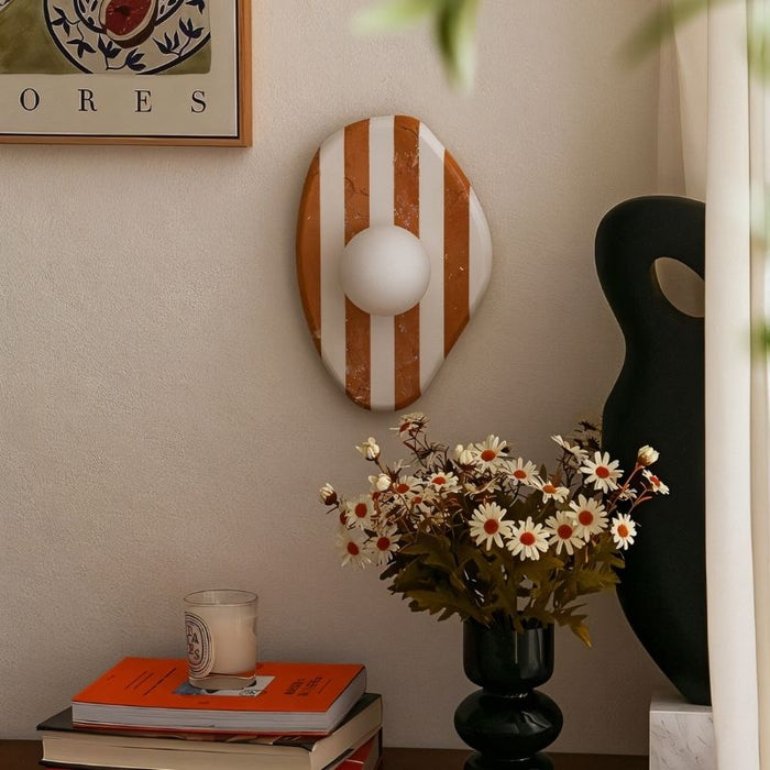 The Jovara Wall Lamp is a sculptural light fixture crafted from stone and glass, featuring a bold, asymmetric form with striped detailing. Its integrated glass diffuser softens illumination, making it ideal for ambient lighting in living rooms, hallways, or bedside settings. The organic shape and natural materials bring a refined yet artistic presence to interiors. Designed for wall mounting, it serves as both functional lighting and a statement decor piece. Available in two color variations to complement different aesthetics.