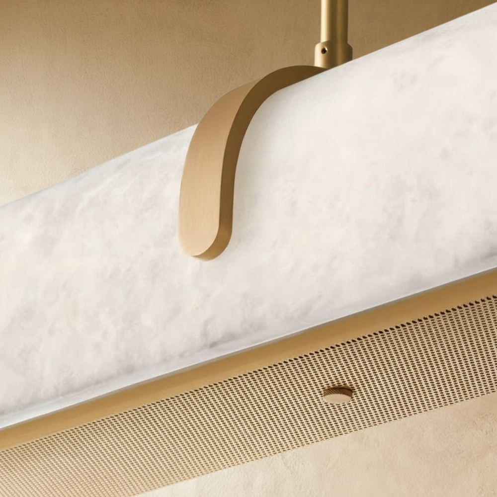 The Kaelen Chandelier features a sleek copper frame with a refined alabaster shade for a modern, timeless look. Its elongated design provides soft, diffused lighting, perfect for dining tables, kitchen islands, and contemporary spaces. The suspended linear form blends elegance and functionality, making it a striking statement piece.