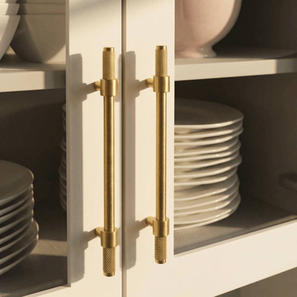 Solid brass handles with knurled edges provide a comfortable grip and enduring style — perfect for enhancing the functionality of cabinets and doors in modern spaces.
