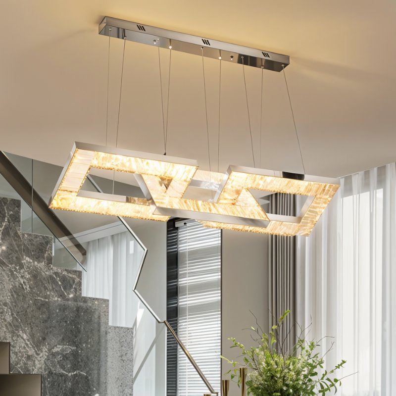 The Lanac Chandelier blends grandeur with modern design, featuring interlocking crystal-covered rectangular frames. Crafted from high-quality metal with gold-plated and chrome finishes, it sparkles from every angle. Ideal for offices, living rooms, dining areas, and more, this chandelier adds an exotic touch of elegance and refinement to any space. Perfect for both private and public environments.