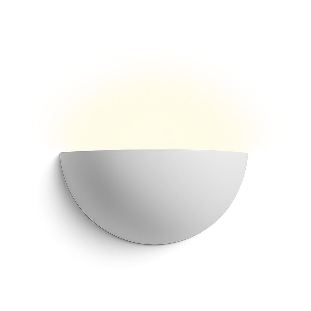 The Lauka Wall Light is a sleek light fixture made from gypsum and aluminum, designed in a refined half-sphere shape that directs soft light upward. Its minimalist style enhances the ambiance of hallways, bedrooms, and living rooms. This modern lamp seamlessly blends simplicity with elegance, ideal for contemporary spaces.