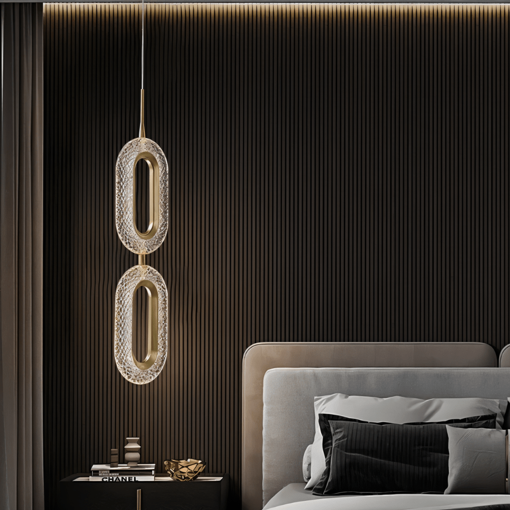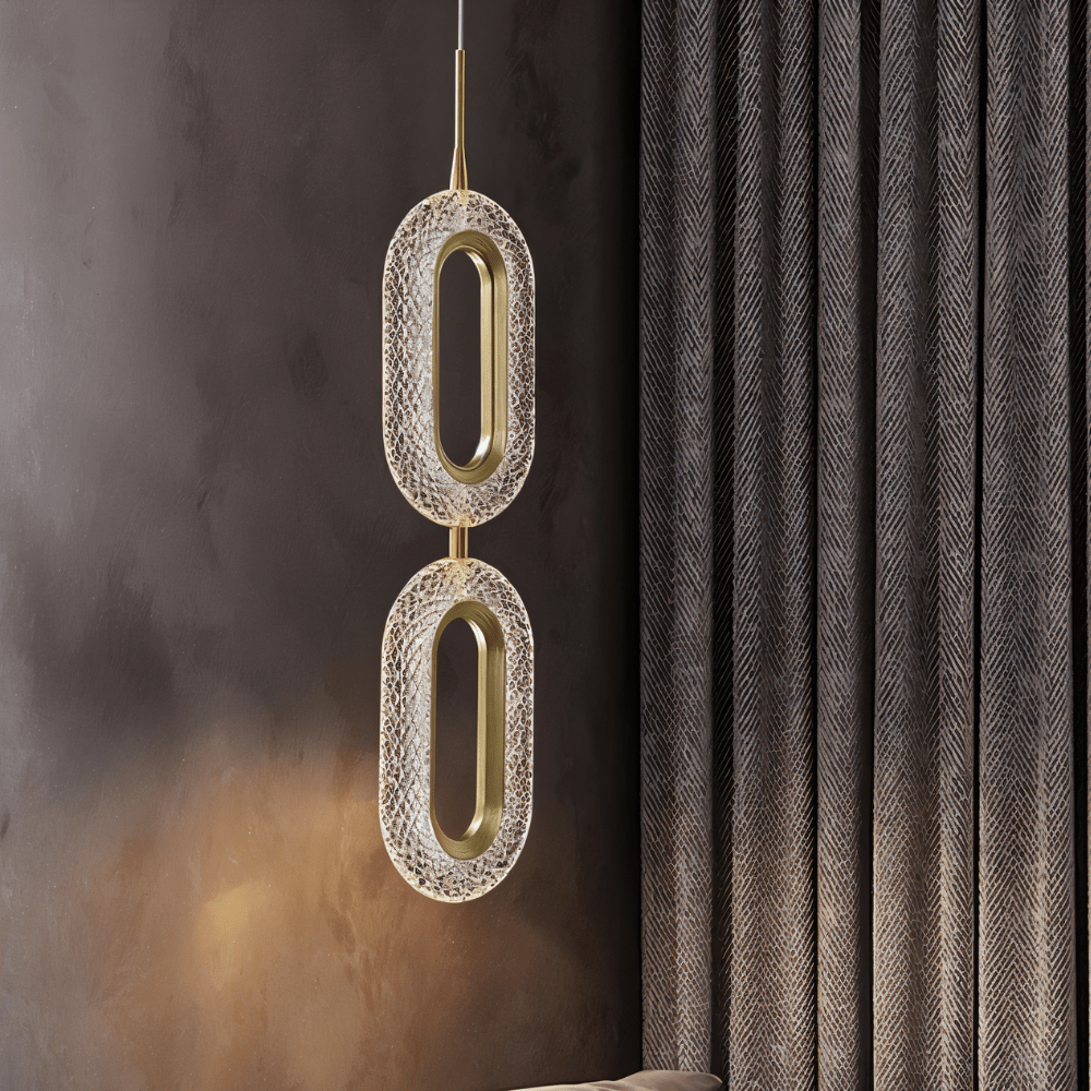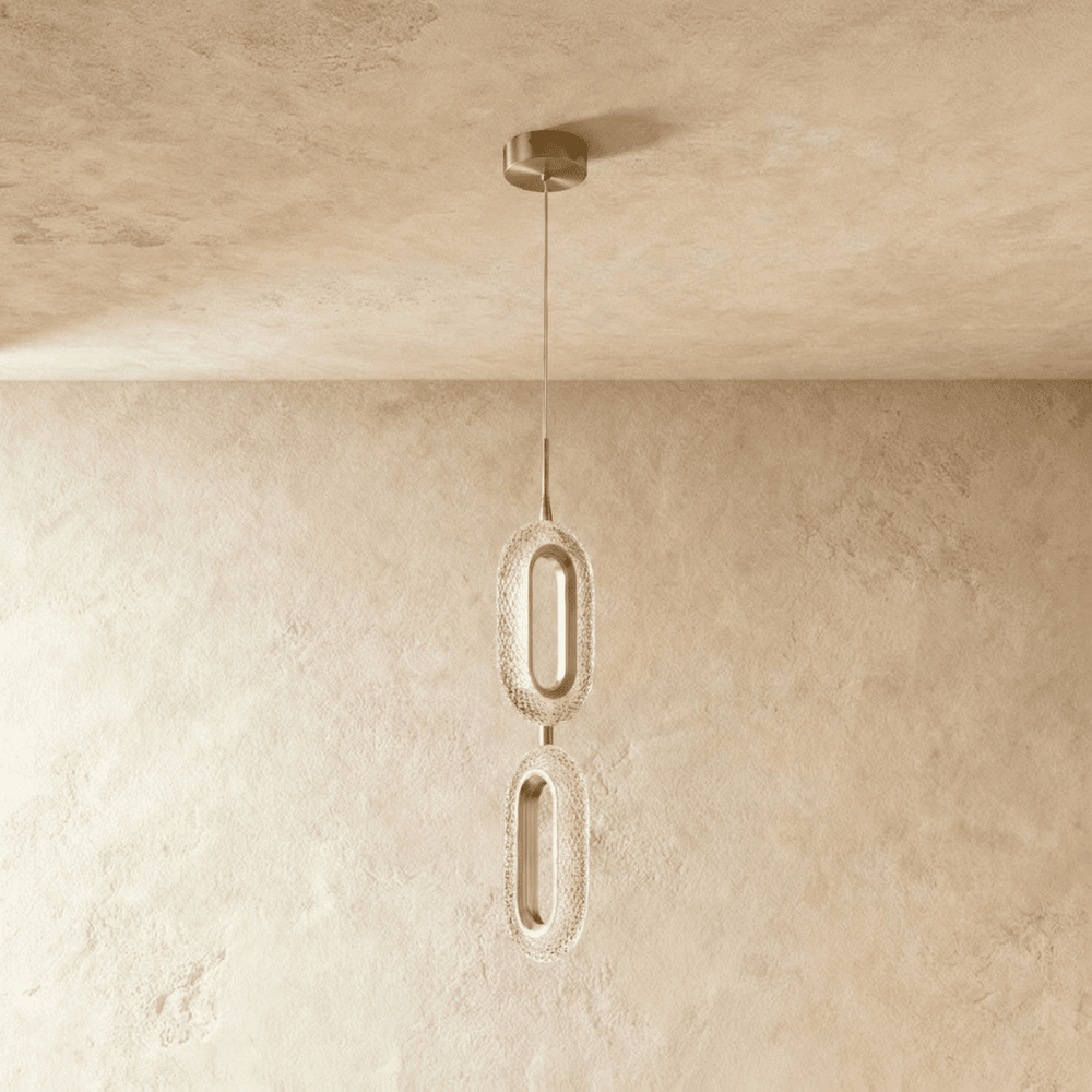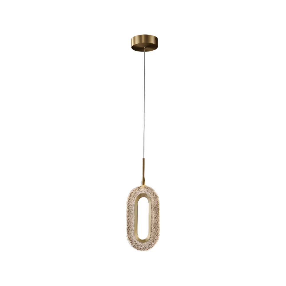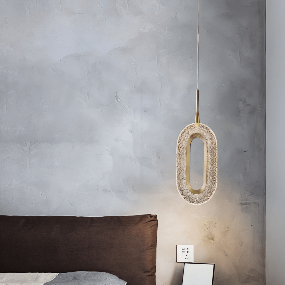 The Luxin Pendant Light features a sculptural oval light fixture crafted from copper and aluminum, enclosed in a textured acrylic lampshade that diffuses a warm, ambient glow. Its suspended form and precision-cut silhouette make it a standout accent for modern bedrooms, dining areas, or hospitality interiors. The brushed metallic body pairs sleekly with the rough acrylic edges, creating a striking contrast. Designed for vertical installations, it complements minimalist and industrial décor schemes. Ideal for spaces seeking an artful, contemporary lighting solution.