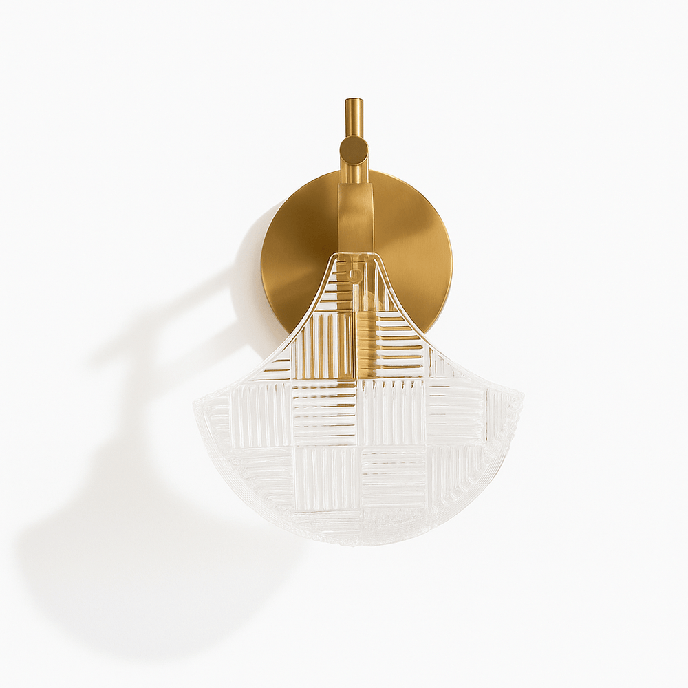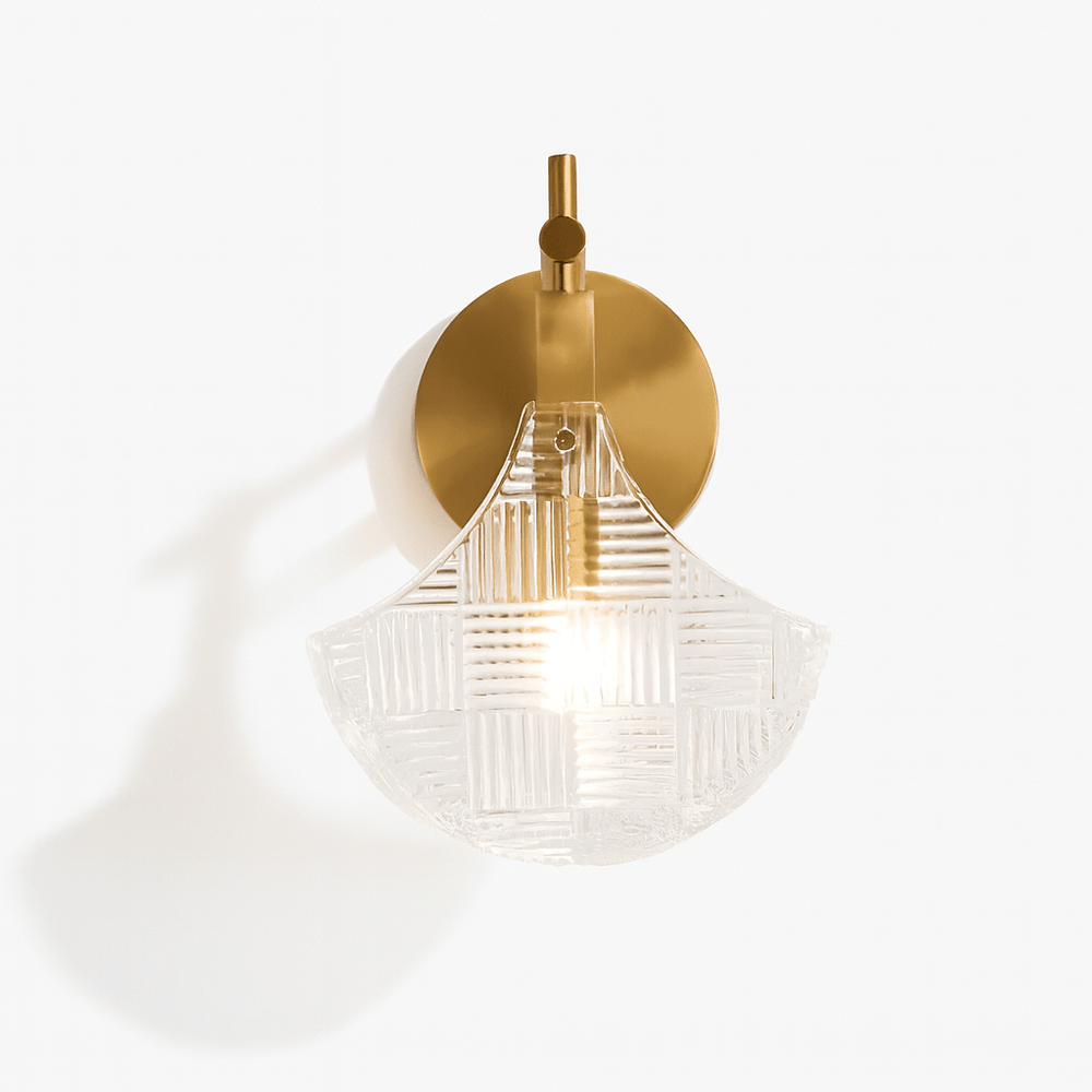 The Minel Wall Lamp combines a sculptural brushed copper arm with a fluted glass shade featuring a modern plaid pattern for elegant wall illumination. This light fixture is crafted from durable copper and precision-cut glass, offering a refined balance of luxury and function. Its curved mount and compact profile make it ideal for hallways, bedrooms, or vanity areas. The wall-mounted design delivers focused ambient light while serving as a decorative accent. Suitable for both residential and boutique hospitality settings.