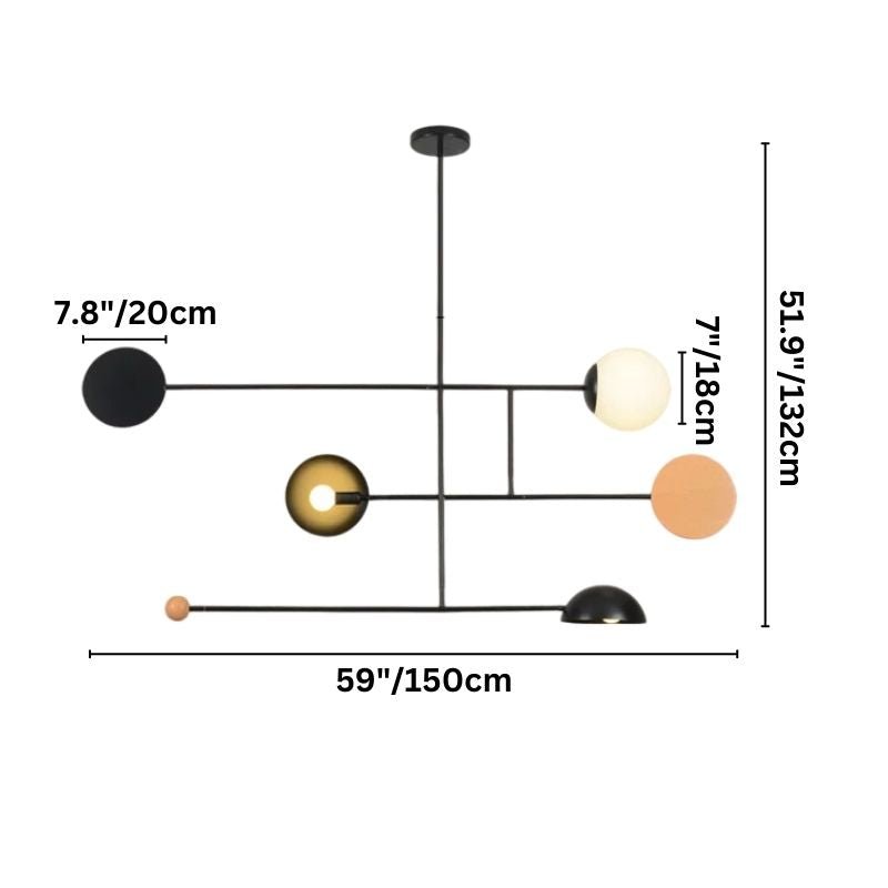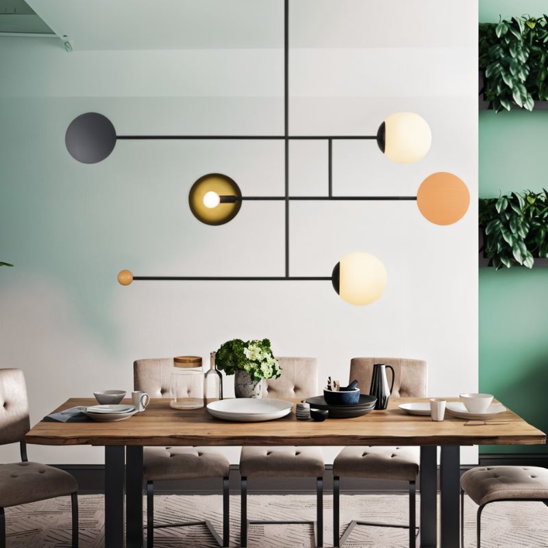Inspired by beautifully balanced hanging kinetic mobiles, the Niamh fuses planet-like structures in wood, steel, and luminous white glass orbs to balance itself as it hovers in the air. This vertical fixture conceals its wires within the arms while preserving flawless parallel line structures and achieving a fixed equilibrium with weight and steel shafts. Offered in a black powder-coated finish in a number of styles, Niamh is ideal for both residential and commercial spaces, including offices, living rooms, dining rooms, kitchen islands, cafes, galleries, and so forth.