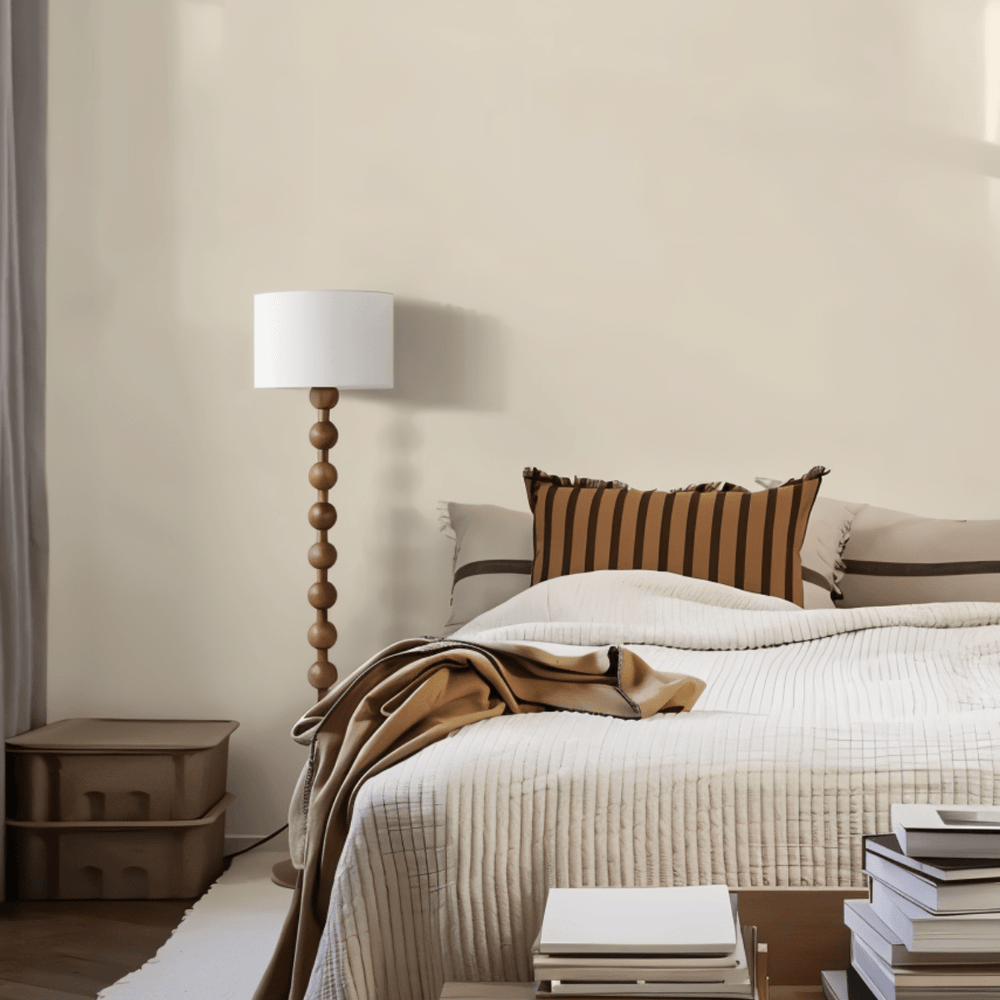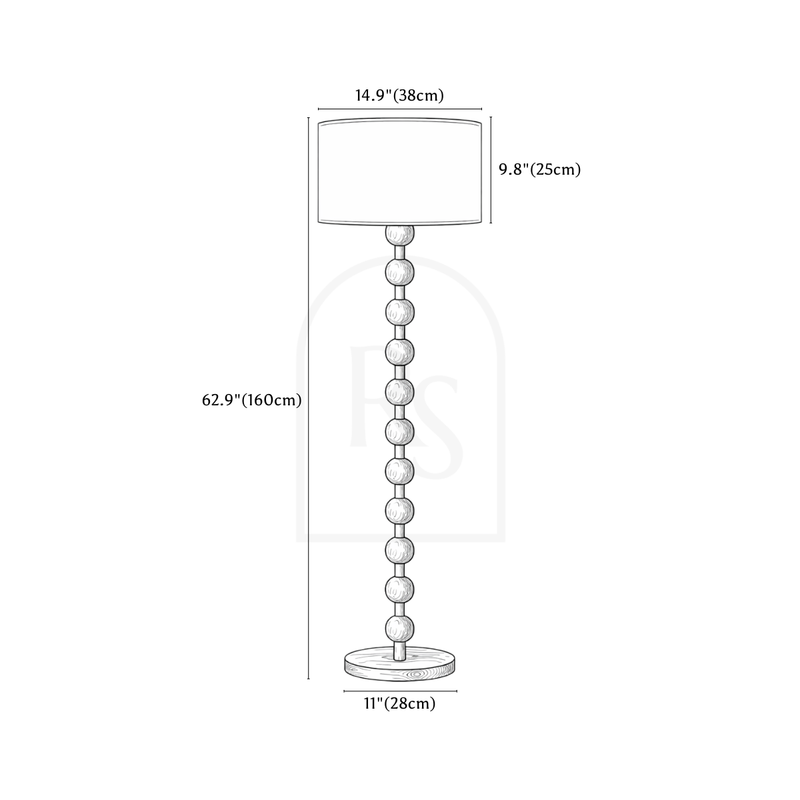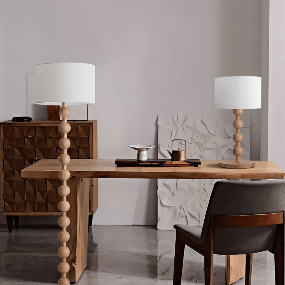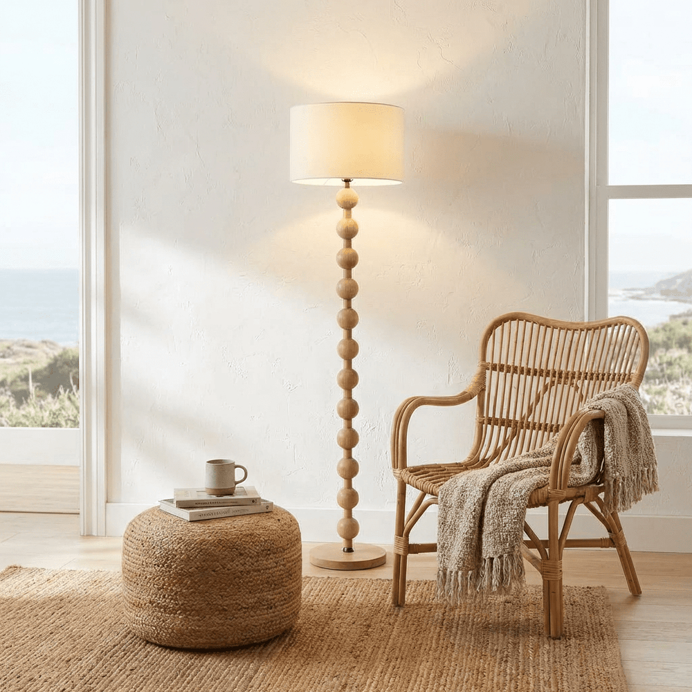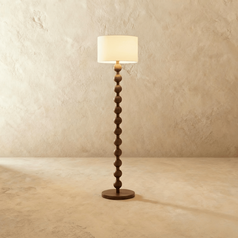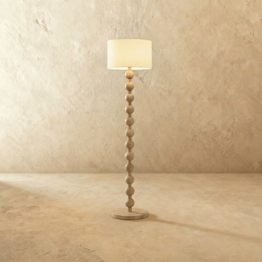 Olan Floor Lamp sets a calm rhythm in the room, casting a warm halo at eye level. Hand-turned solid wood spheres stack along the stem, revealing natural grain and subtle tonal shifts. A fabric shade diffuses light into a soft, even glow that settles the bedroom, living room, or dining room. Anchored by a round wood base, it brings vertical balance and quiet structure to the space.