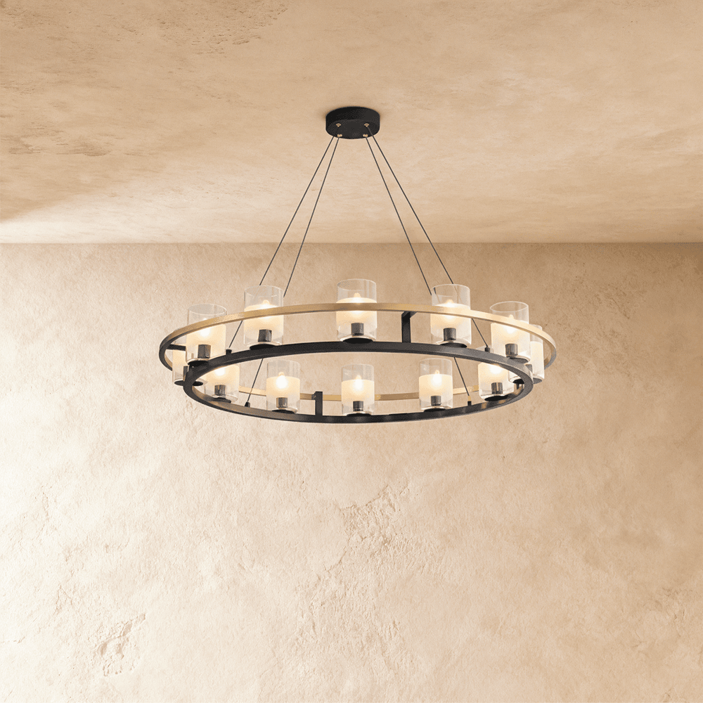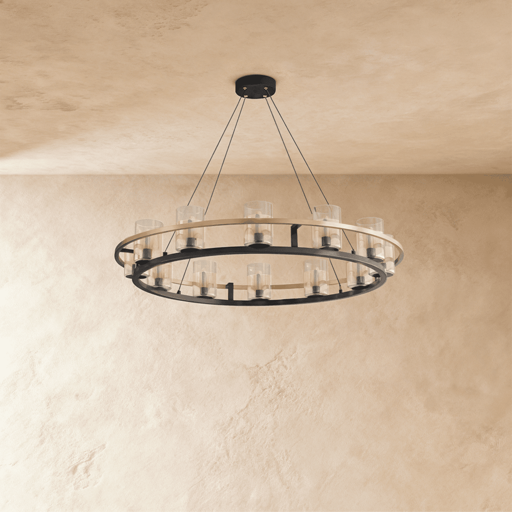 The Orvia Chandelier is a striking light fixture crafted from premium copper with elegant glass lampshades, exuding a refined contemporary appeal. Its dual ring design combines matte black structure with a lustrous gold accent, creating a balanced visual statement perfect for living rooms, dining spaces, or entryways. The frosted glass diffuses light softly, evoking a warm, inviting ambiance while showcasing the fixture’s sculptural quality. It offers versatile sizing to complement various interior scales. This chandelier elevates any room with its sophisticated, modern silhouette.