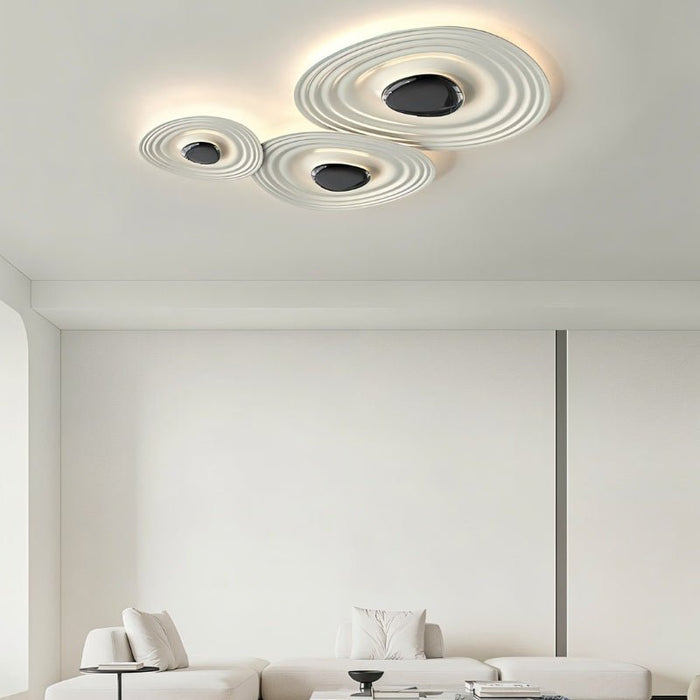 The Pafli ceiling light is a sculptural light fixture crafted from durable metal and iron, featuring a ripple-inspired design that creates a striking visual effect. Its layered circular structure emits soft, indirect illumination, adding depth and dimension to modern interiors. Ideal for living rooms, lounges, and statement ceilings, this ceiling light enhances contemporary spaces with its artistic form and ambient glow. The flush-mount installation ensures seamless integration, making it a perfect choice for homes, hotels, and upscale commercial environments.