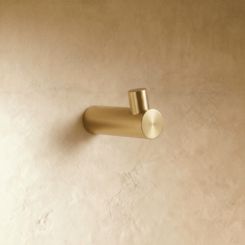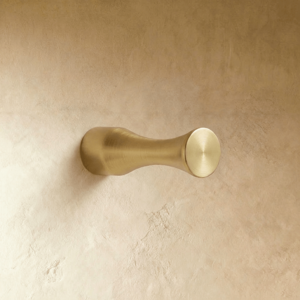 Crafted from solid brass, the hook features a smooth brushed finish that highlights the warmth and depth of the material. The compact shape feels tactile and substantial while maintaining a calm, minimal aesthetic.