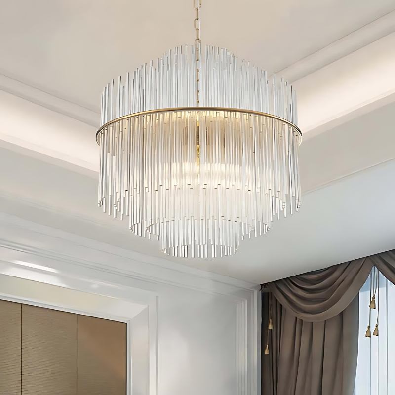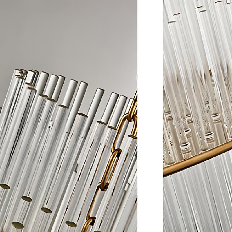The Rapture Chandelier creates a luxurious look with its high-quality iron construction, elegant gold finish, and cascading glass rods, embodying post-modern style and serving as a stunning centerpiece that enhances the ambiance and complements other gold elements in your home.