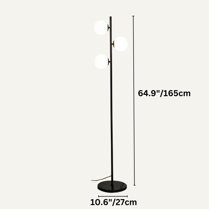 Rulaina Floor Lamp has a sleek black metal frame, marble base, and milky white glass lampshades. The lampshades provide soft, diffused light, creating a cozy atmosphere. Easy to assemble and maintain, this lamp is both stylish and functional. This sleek floor lamp would be perfect next to a cozy armchair in a living room or bedroom reading nook.