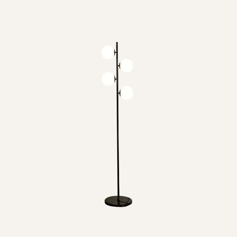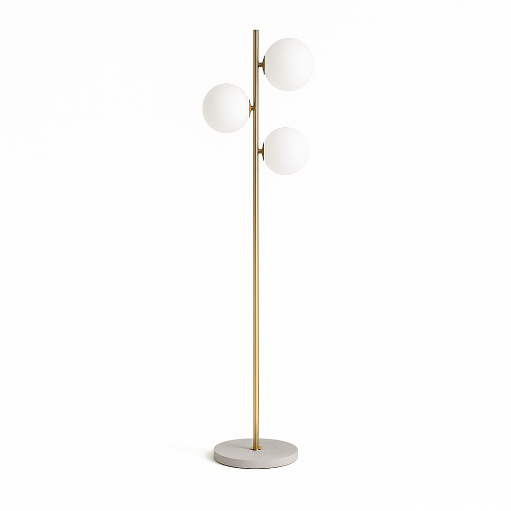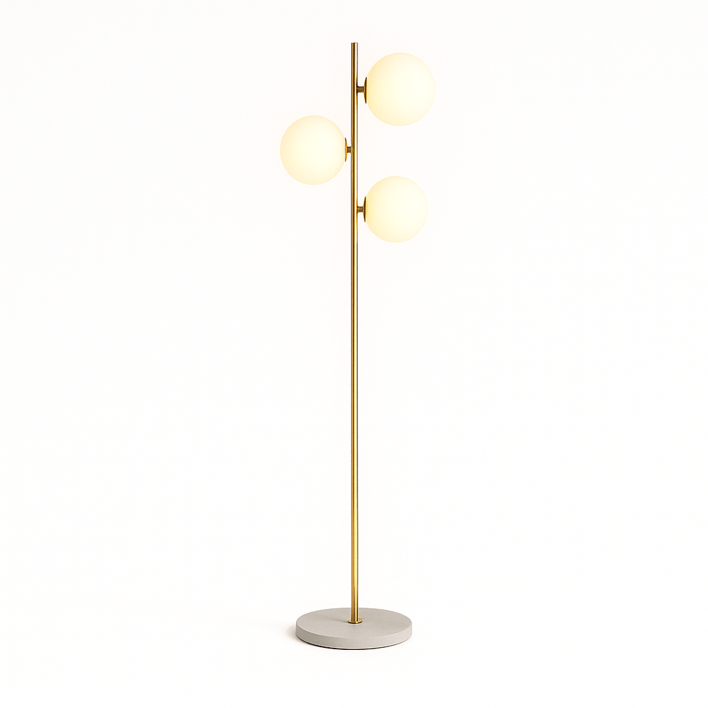 The Rulaina Floor Lamp is made with a brass-finished metal frame, frosted glass globes, and a sturdy stone base, ensuring both elegance and stability.