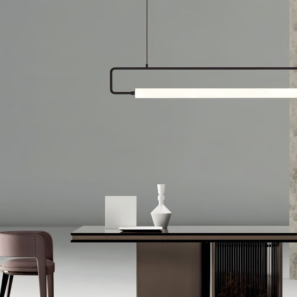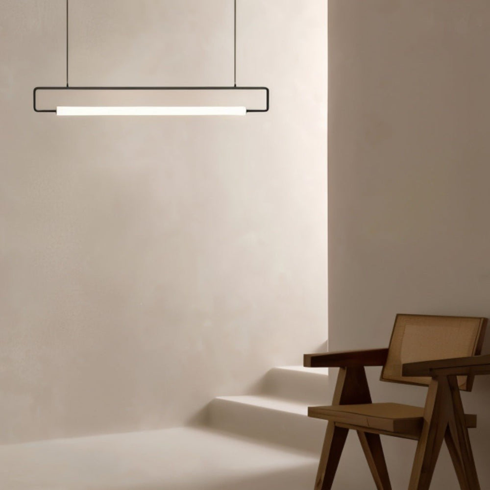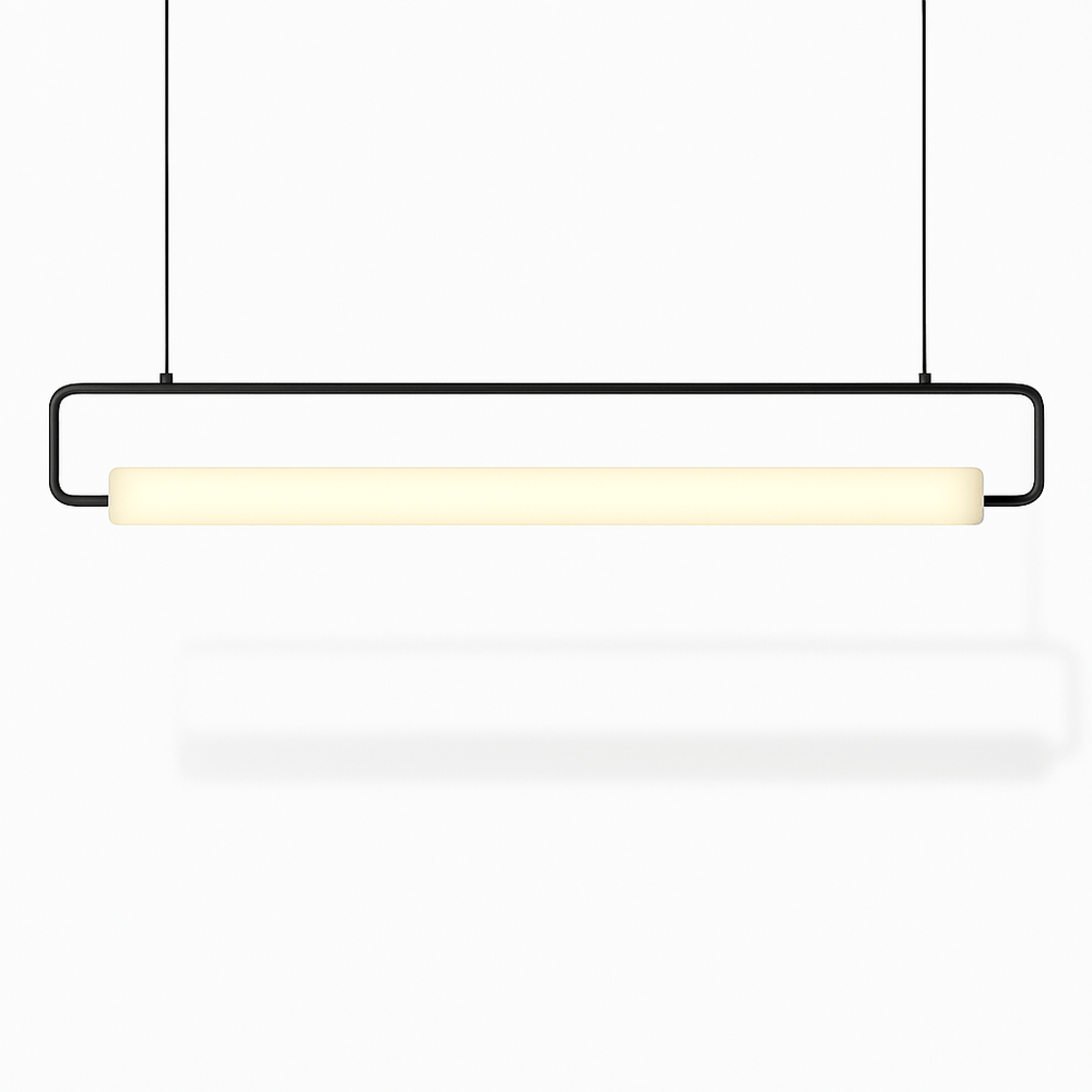 The Sanaa Pendant Light is a stunning example of modern design, characterized by clean lines and a sleek, bar-like form gracefully suspended by two wires. Its unique and distinctive presence effortlessly complements any decor, casting a soft, inviting glow that elevates your space with style and sophistication. Illuminate your surroundings with the elegance of the Sanaa and take your interior ambiance up a notch.