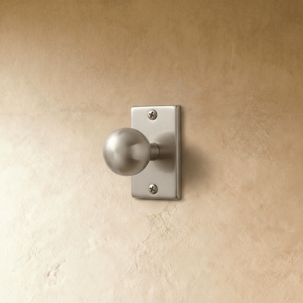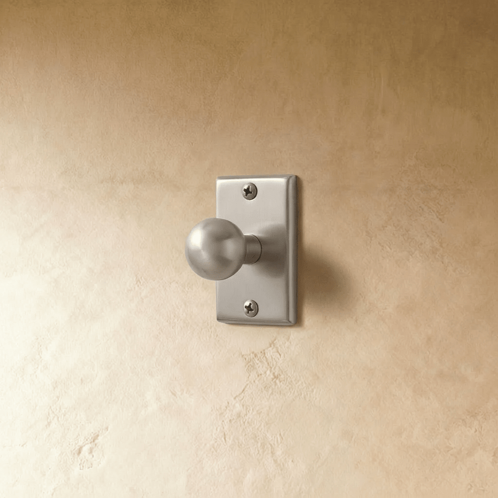 Senoa Knob is solid brass with a brushed finish that softens over time. The sphere is machined from solid stock and set on a rectangular backplate with exposed screws. The plate frames the form and shields the cabinet surface. It adds weight and order to flat doors and painted fronts.