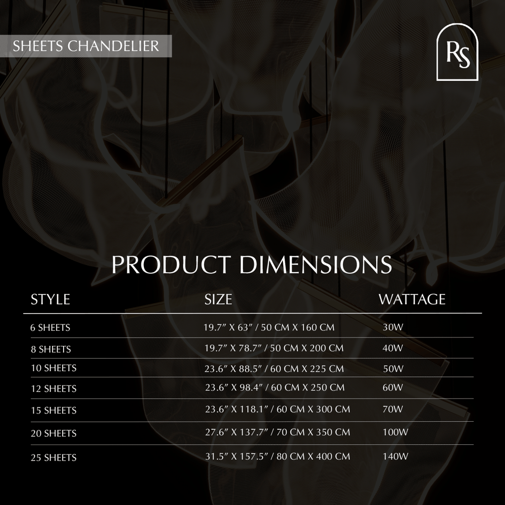 The Sheets Chandelier is designed for indoor use, bringing modern elegance to spaces like living rooms, dining areas, offices, or meeting rooms. Its high-quality stainless steel construction ensures durability, but it is not specified for outdoor use. For optimal performance and longevity, we recommend installing this stunning fixture indoors.
